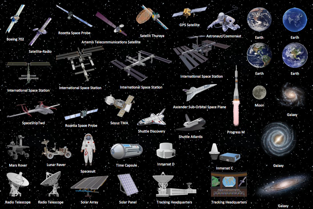 Using Aerospace library for ConceptDraw DIAGRAM allows you to produce professional-looking illustrations in seconds. All clipart is ready to use. All you need to do is add layout shapes and text labels.
