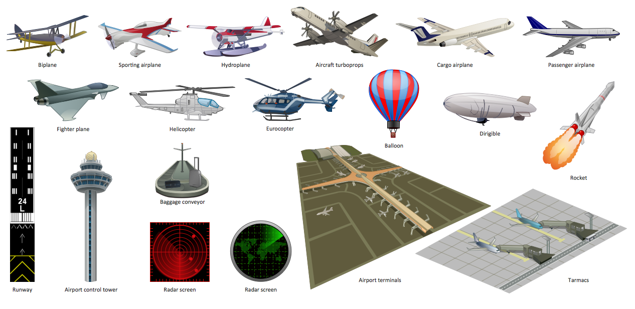 All source documents are vector graphic documents which are always available for modifying, reviewing and/or converting to many different formats, such as MS PowerPoint, PDF file, MS Visio, and many other graphic ones from the ConceptDraw Solution Park or ConceptDraw STORE. The Aerospace and Transport solution is available to all ConceptDraw DIAGRAM users to get installed and used while working in the ConceptDraw DIAGRAM diagramming and drawing software.