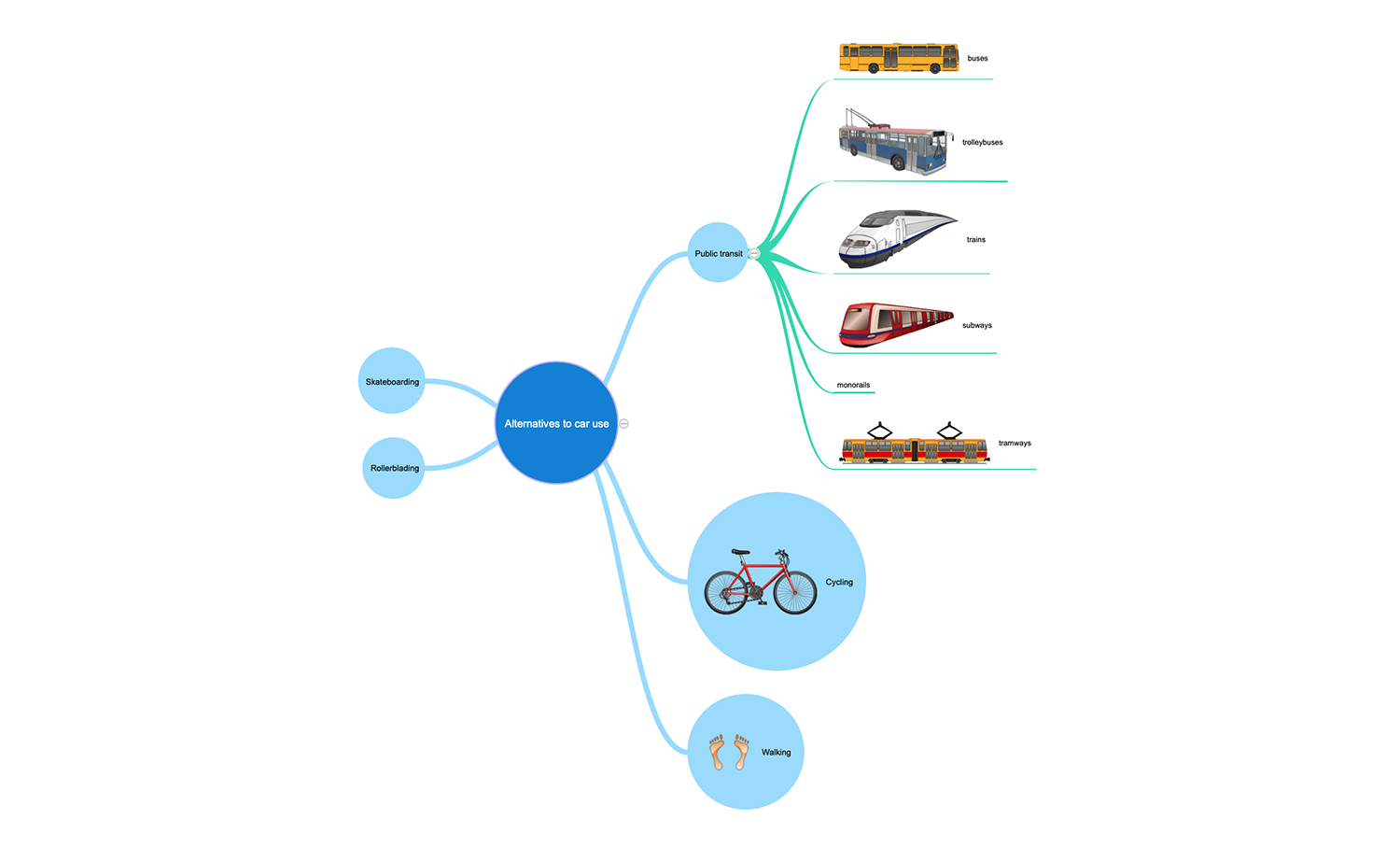 Despite the wide prevalence of cars in a modern world, not each person on the planet has it and not everyone has the opportunity to use it constantly, moreover, the car’s use is possible not in all situations and not in any place on the planet. But at the same time, we have many alternatives today. This Mind Map sample represents the diversity of existing transport vehicles, which are the alternative to car use. First of all, it is a group of public transport including buses, trolleybuses, trains, subways, monorails, and tramways. You can also use the private individual kinds of transport, such as cycling, skateboarding, rollerblading, or walk afoot that is the best way to cover the short distances, besides it is a way the most useful for health. It is excellent that ConceptDraw MINDMAP offers a huge variety of graphic elements to illustrate the topics of this Mind Map.