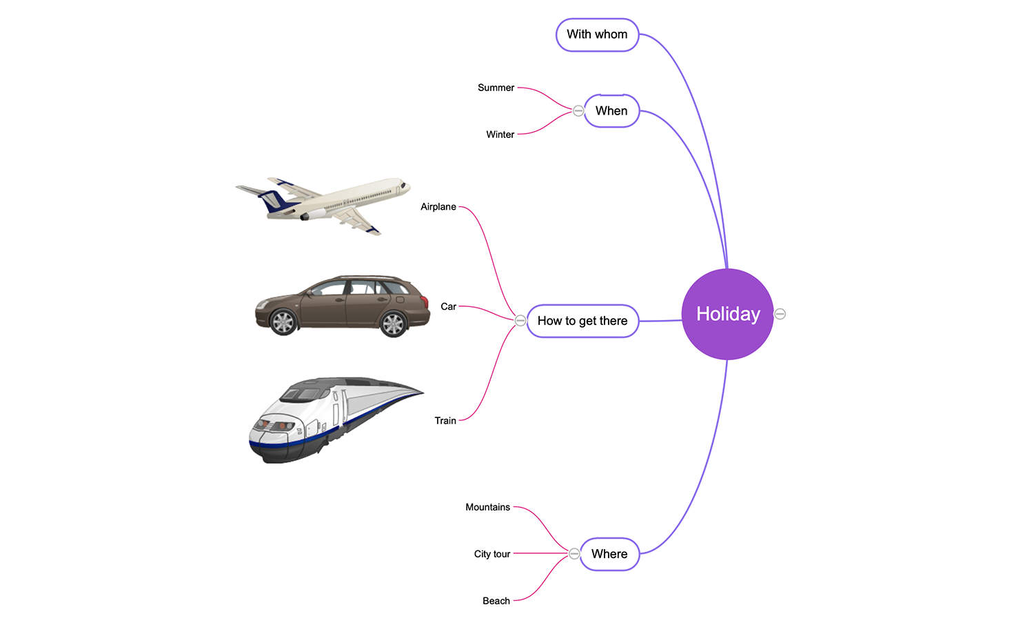 How to spend the holiday in the best way? Who hasn't thought about that? This Mind Map is a kind of a plan containing the key points in a planning a holiday, it depicts the questions which the major part of people thinks about. Four main questions with the most common options are presented on this map — when to go on vacation (winter or summer), where to spend it (mountains, city tour, or beach), how to get there (airplane, car, or train) and the most important —who to take along for the ride to spend the upcoming vacation. Do you have any other ideas about your holiday? Feel free to add them to the map as additional topics and subtopics, decorate them with graphics clipart and enjoy by the bright and attractive Mind Map. Outline the countries, cities, and places that you dream to visit, and then visually check the visited ones after your trip.