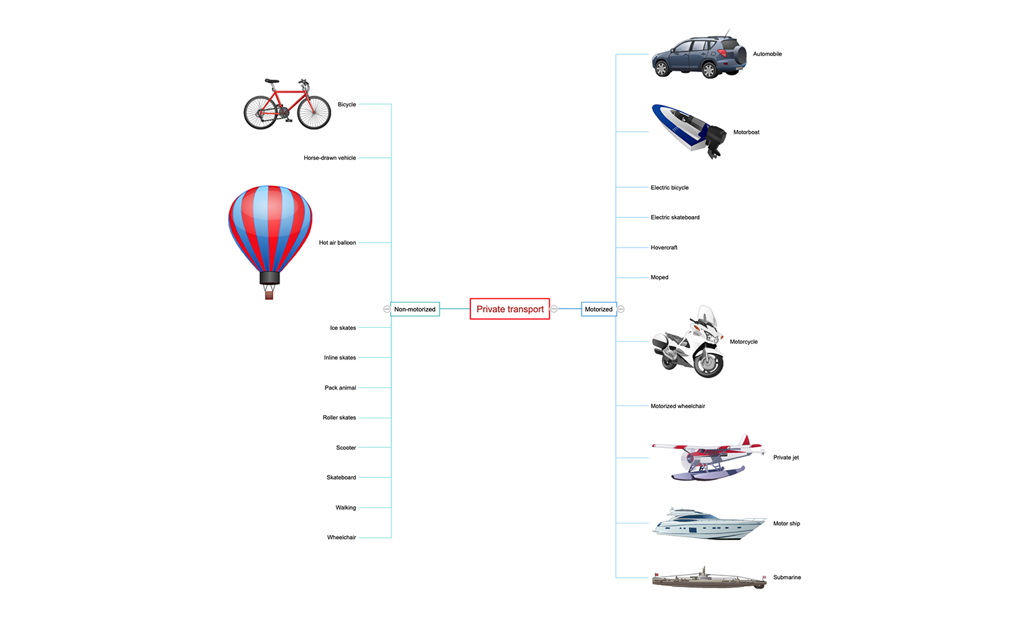 This Mind Map represents all diversity of the private transport that is convenient to overcome the distances at any time when it is necessary, regardless of the precise schedule. There are allocated two large groups of private transport: the motorized (transport working by means of a motor) and non-motorized (without a motor, driven in any other way). The first group includes the automobiles, motorboats, electric bicycles, electric skateboards, hovercrafts, mopeds, motorcycles, motorized wheelchairs, private jets, motor ships, and submarines. The last one includes not less quantity of vehicles, among them the bicycles, horse-drawn vehicles, hot air balloons, ice skates, inline skates, pack animals, roller skates, scooters, skateboards, walking, and wheelchairs. The transport’s groups are visually placed on opposite sides from the central idea that is highlighted with red color. Some topics have the accompaniment clipart, other ones can be also supplied with corresponding graphical clipart from the ConceptDraw MINDMAP graphics libraries.
