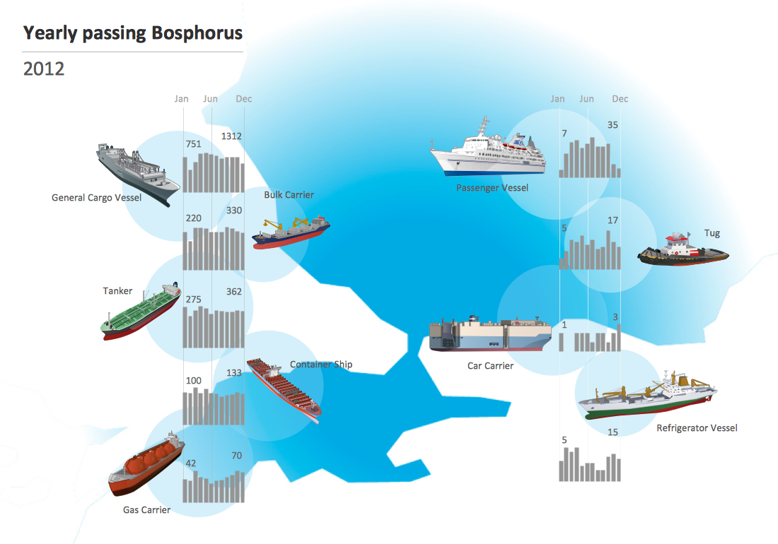 Using Transport library for ConceptDraw DIAGRAM allows the user to produce professional-looking illustrations for visualization needs at any level of complexity. Professional looking clipart helps make detailed infographics that can communicate specific critical metrics to the rest of your organization. The combination of shipping vessels and charts conveys the documents meaning with a single glance. ConceptDraw DIAGRAM is a powerful tool for the assembling of these tools.