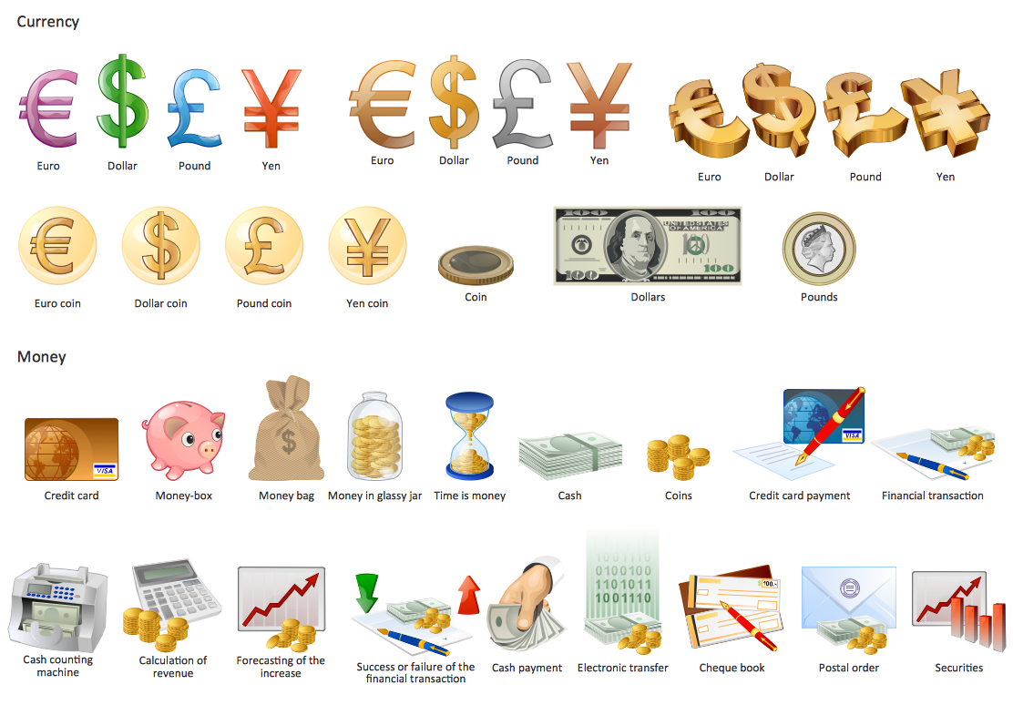 Using the Time and Money libraries for ConceptDraw DIAGRAM allows the user to produce memorable and impressive business illustrations in seconds. High-resolution vector illustrations are perfect for presentation needs. This illustration scales properly for large screens.