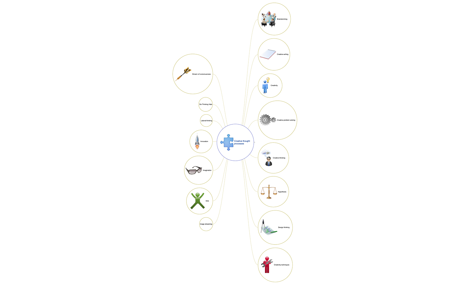 This Mind Map sample outlines the processes of creative thought and modern methods of innovation and generation ideas, solutions and thoughts. Thinking is a cognitive activity of the person, mental and psychological process of search of the correct decision, proceeding from available data on a defined problem or task, the possible ways of its solution with the greatest benefit, the process of modeling of laws of the surrounding world. It is also distinguished the creative thinking that is a way of looking at the situations, actions, or problems from the another, fresh perspective. The creative thinking is incredibly useful in many situations and can be stimulated by such well-known techniques, as mind mapping, brainstorming, thinking hats, lateral thinking, and many others presented on this diagram. Succeed in creative thinking, use its effective methods, techniques, and tricks and you are going to solve any task or problem in a few minutes.
