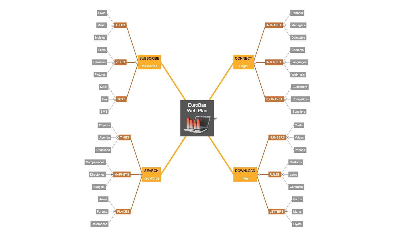 This Mind Map sample demonstrates the EuroBas system web plan. The web system supposes the entering of login to connect to the system, the subscribe to messages and news, the use of keywords in filling texts to be well searched by the searching systems, and allows downloading the files. The Subscribe, Connect, Search and Download are the topics of the first level for the main idea, each of these topics has three subtopics, which at their turn have also three subtopics each one. It is a typical structure of a Mind Map and ConceptDraw MINDMAP software allowed designing it neatly and precisely. Pay attention that the topics of the same level are colored identically and different levels vary in a color filling. The color difference along with the use of ready-made clipart is the best way to make your map visual. The large variety of solution's graphics sets is going to be the real help in illustrating your Mind Maps.