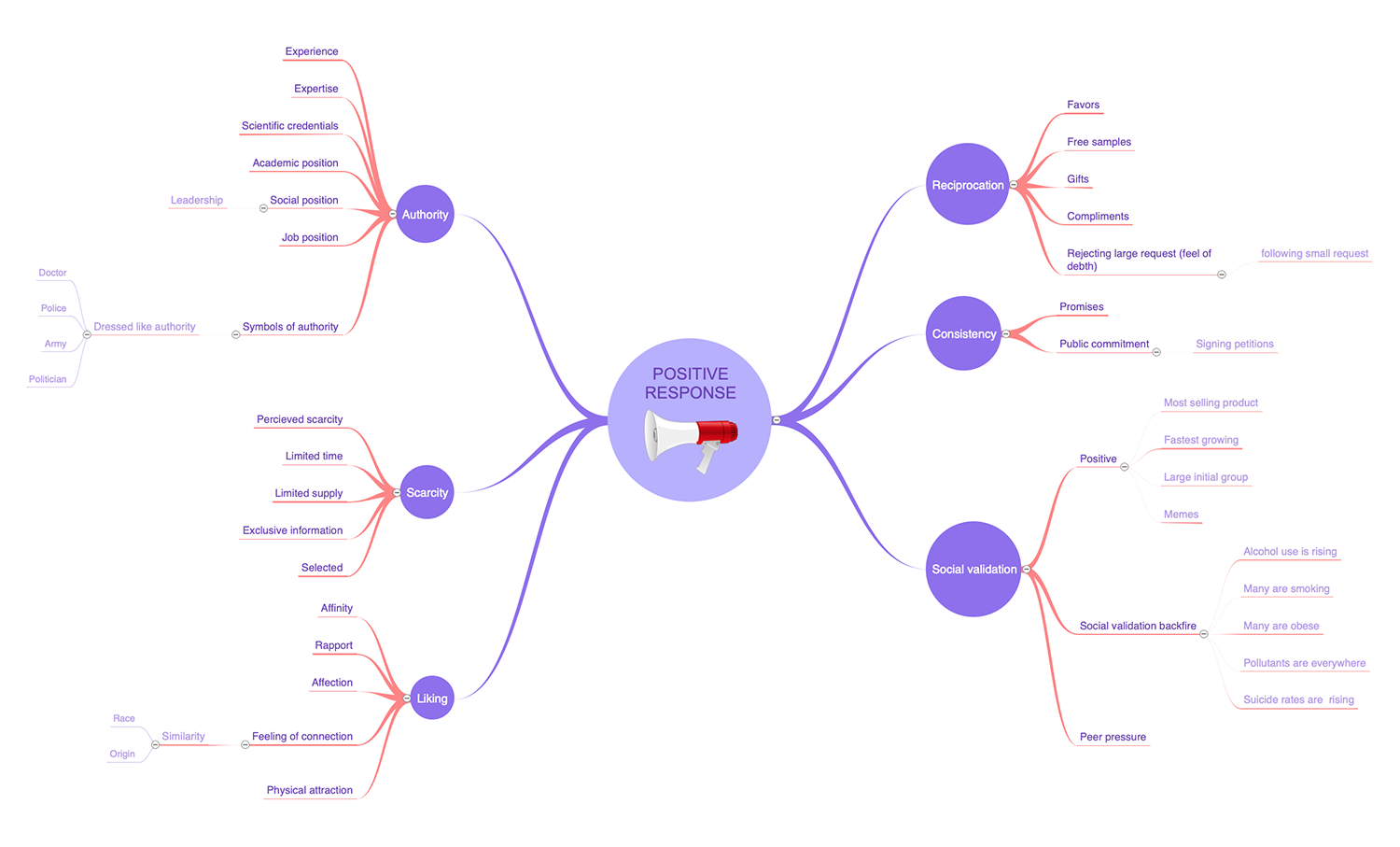 This Mind Map sample is dedicated to the ways of achieving a positive response. There are distinguished six main types of behaviors and actions to get a positive response: authority (when you show your power and dominance), scarcity (when the illusion of lack is created to provoke a quick solution making, for example about a purchase), liking (plays a great role and positively influences on the people actions in contrast to our actions when we don't like something), reciprocation (the desire to do something in return on some positive action made to us), consistency (when a general agreement and unity is achieved) social validation (providing the evidence that the product or service meets the end user requirements). It is a multi-layer map because all listed main ways have many subitems and additional related information that the author also wanted to present on this Mind Map. ConceptDraw MINDMAP ideally suits for designing multi-layers maps.