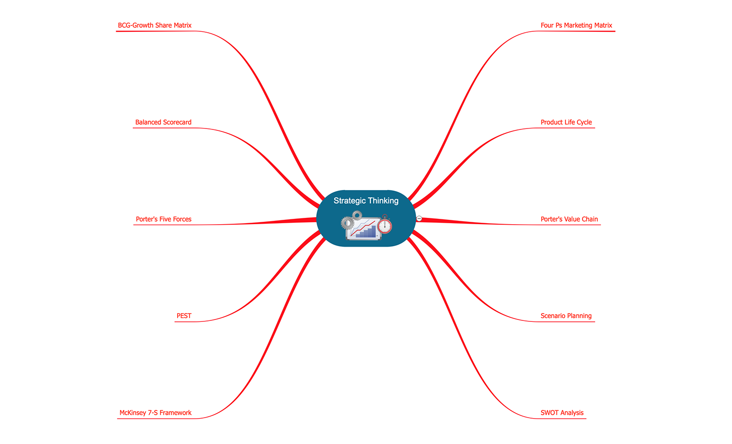 This Mind Map describes the most effective concepts and methods of strategic thinking. There are represented the following ones: BCG-Growth Share Matrix, Balanced Scorecard, Porter’s Five Forces, PEST, McKinsey 7-S Framework, Four Ps Marketing Matrix, Product Life Cycle, Porter’s Value Chain, Scenario Planning, SWOT Analysis. The strategic thinking is determined as a human's thinking or mental process applied to reach goals and to achieve success. It is the ability to solve any problem and task and to reach success in any situation by means of the precise system and program approach. The strategic thinking is a highly valuable skill, it is the ability to know precisely what you want to achieve and how to do it. It lets generating the unique business insights and so ensures easy achievement the competitive advantage in highly competitive and fast-changing conditions, that gives the unique opportunities in business, marketing, management, and many other fields of activity.