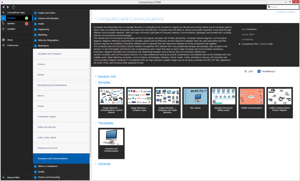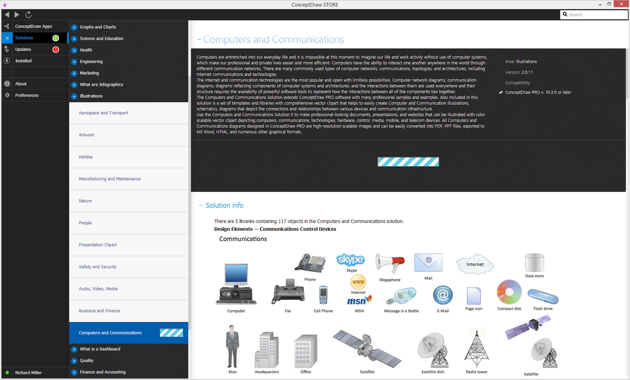 After ConceptDraw STORE and ConceptDraw DIAGRAM are downloaded and installed, you can install the Computers and Communications solution from the ConceptDraw STORE.