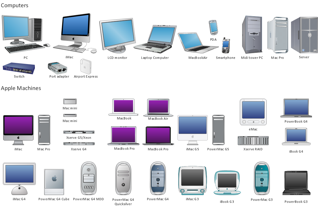 This example was created in ConceptDraw DIAGRAM using the Apple Machines library from the Computers and Communications solution. An experienced user spent 15 minutes creating this sample.