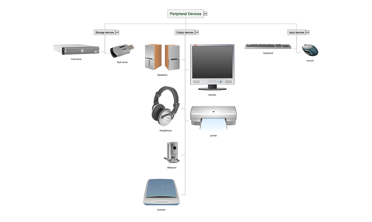 This Mind Map represents the diversity of the peripheral devices, which are equipment used to put information into the computer and also to get it from it. The peripheral devices are computer hardware that is structurally separated from the computer and connected to it with special connectors, they operate under its management and are not obligatory devices for the system’s operation, so can be disconnected at any time without the consequences. However, they expand the computer’s functionality, allow organizing the input and output, printing the texts and illustrations, data exchange, etc. There are existing three main categories of peripheral devices, all three were outputted on this Mind Map, among them the group of storage devices including hard drive and flash drive, the output devices’ group containing monitor, printer, speakers, headphone, webcam, scanner, and finally the group of input devices including keyboard and mouse. Add more examples of the peripheral devices, if necessary.