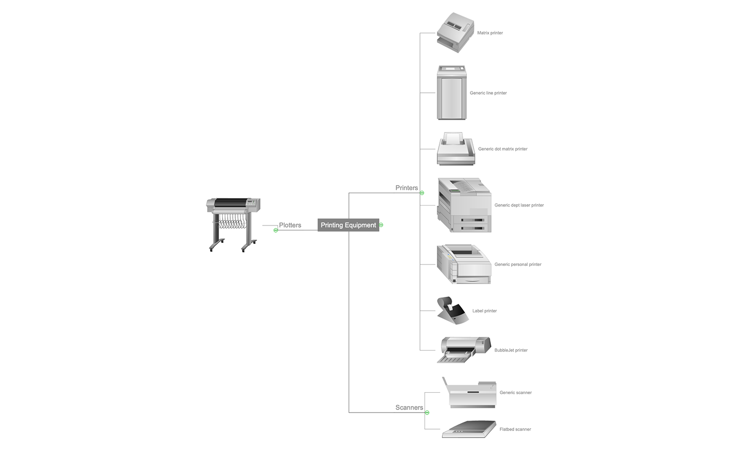 This Mind Map sample represents the variety of existing printing equipment, which is the external peripheral devices developed to output the textual and graphic information stored in a computer on the paper or tape. Among the printing equipment there are printers, scanners, and plotters. The group of printers includes the matrix printers, generic line printers, generic dot matrix printers, generic dept laser printers, generic personal printers, label printers, BubbleJet printers. The group of scanners includes just the generic scanners and flatbed scanners. Such diversity is conditioned by the fact that the world of technologies is constantly changing and developing, and the printing equipment is not an exception. Since its appearance, the printers became almost indispensable and turned from the exclusive equipment for large companies to the ergonomic devices available to almost everyone. The laser and inkjet printers are the most popular today, each of these types of printers has certain advantages and disadvantages.