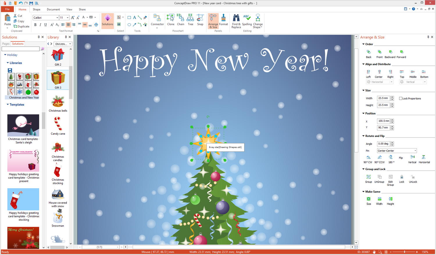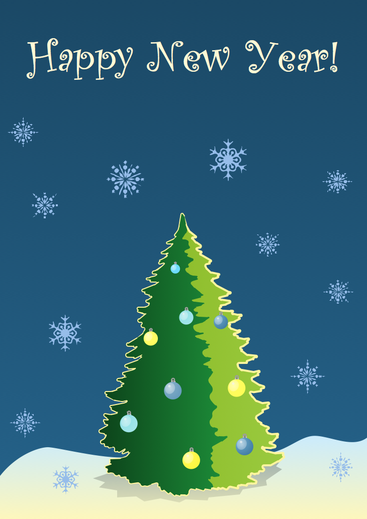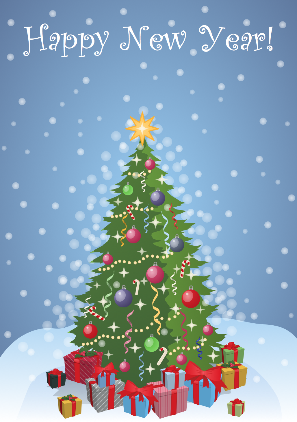 This New Year card example demonstrates the “Christmas Tree with Gifts” greeting card created in ConceptDraw DIAGRAM using ready-made merry Christmas clipart and Christmas Tree clipart. A simple elegantly decorated Christmas tree is shown on a soft winter blue background, coated with snowflakes. Around the pine tree there are a lot of beautifully wrapped up gifts, saying “Happy New Year” on top. What could be simpler? However, how much warmth, love and sensation of the upcoming holiday is contained in this simple greeting card? Give it to your friend, dear, beloved one and you will feel how happy he/she becomes as magic penetrates his/her house and heart. Add some additional words, your own sincere wishes to this greeting card and present it independently or place it on a gift.