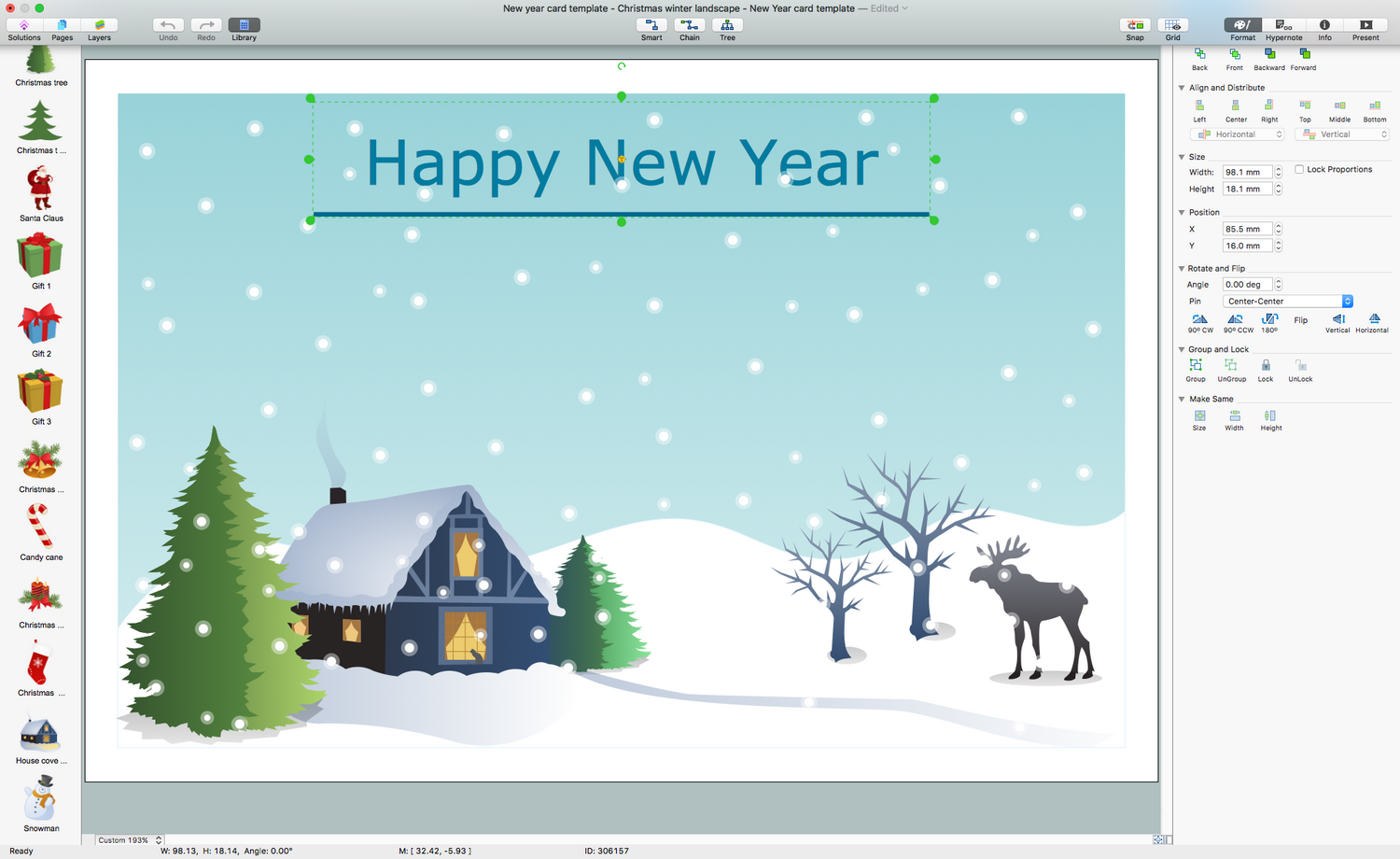 This "Christmas Snowflakes and Gifts" template is a professionally-designed greeting card template. It was created specifically to give ConceptDraw users the opportunity to easily prepare New Year and Christmas greetings, because ready-made greeting cards are incredibly convenient for congratulating, creating a personal or official card, greeting a special event, making a surprise or just a compliment. Having a ready template you don't need to worry about the design and beauty of your greeting card, just type the text, if needed add some additional decorative elements or Christmas clipart on your desire, and exceptionally designed postcard is done. If you decided to make a greeting card yourself, the ConceptDraw's New Year invitation template will be the best choice. You can also add a bright slide to the presentation — congratulations of the season will make winter days warm and cheerful.