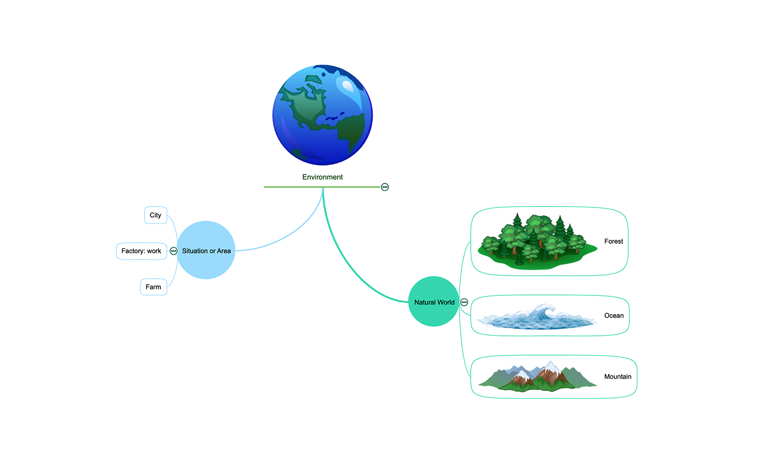 This Mind Map sample describes all surrounding us — our environment. It represents the component parts of the environment, the areas and natural world wealth — forests, oceans, mountains. As general, an environment includes the living organisms and non-living items, as well as physical, chemical and other natural forces. The environment differs within our planet, in each point of the planet the surrounding space has its own properties and conditions, dissimilar climate and natural resources. The living organisms live in these specific conditions and adapt to them. The environment affects greatly the growth and development of living organisms, people and animals, their interactions between each other and with plants, microorganisms, water, soil, sunlight, other renewable and non-renewable natural resources, natural materials, and other non-living things. The use of colorful ConceptDraw MINDMAP's clipart is justified and useful on this and other nature-related Mind Maps — clipart makes them bright and attractive.