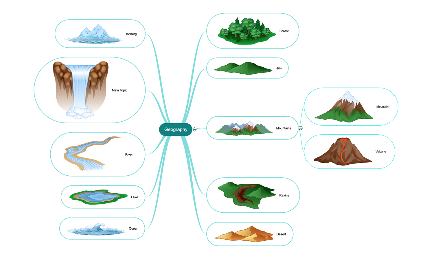 This Mind Map example is dedicated to the geography, the natural resources, conditions and landscape of the Earth. The geography science studies the Earth's surface, the diversity of the natural landscapes and resources, oceans and seas, mountains, volcanoes, deserts, forests, environment, and ecosystems, as well as the interactions between human society and an environment. Our planet is unique and no other celestial body can compare with the Earth in a diversity of nature. That is why the interest in studying the geography of our planet and the deep structure of the Earth arose a long time ago. The water resources are represented in the left part of this Mind Map, such diversity and the presence of water in general made possible the existence of life on the Earth. Besides, the water reserves are concentrated not only in the oceans, seas, rivers, groundwater but also in the atmosphere, in a form of clouds and water vapor.