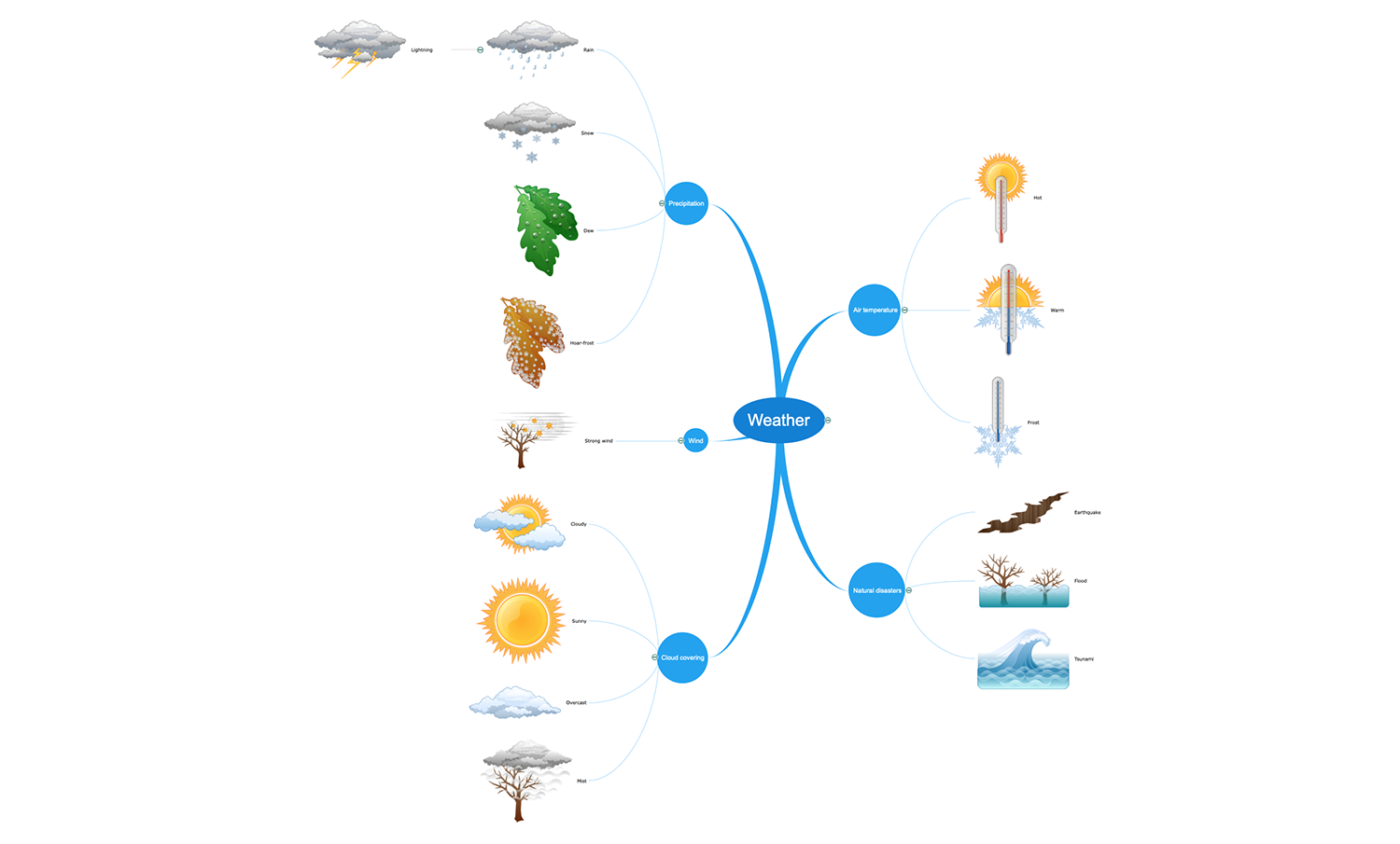 This Mind Map sample represents the diversity of weather conditions. The weather is a change in the atmosphere that occurs day-by-day, hour-by-hour or even more often. The climate and weather conditions diverse in different parts of the Earth, and this diversity includes such natural phenomenons as a sun, wind, rain, lightning, snow, storms, hurricanes, tornadoes, hail, and many others. Typically, the weather is greatly affected by the change of the season. In its turn, the weather influences the different aspects of the life of people and other living organisms, the animals, birds, plants, it defines the way of people's life, their habits, type of clothing, well-being, and lots more. Each weather change presented on this map has a unique image next to it. Use the graphical sets of nature and weather images to make your own meteorological maps for different areas, to brainstorm the ways of behaviors in different weather conditions, to create maps of meteorological forecasts, etc.