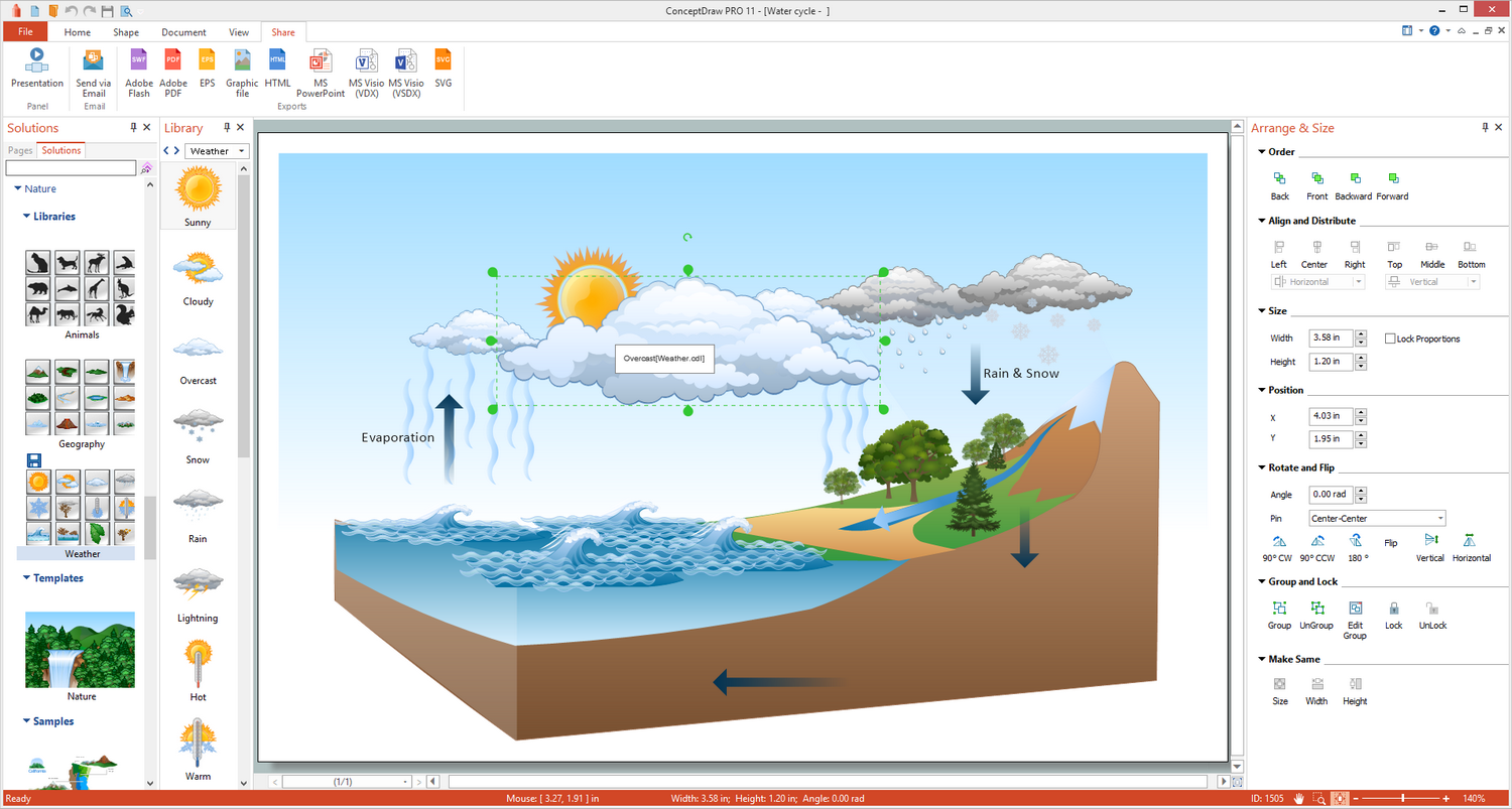 All source documents are vector graphic documents which are always available for modifying, reviewing and/or converting to many different formats, such as MS PowerPoint, PDF file, MS Visio, and many other graphic ones from the ConceptDraw Solution Park or ConceptDraw STORE. The Nature solution is available to all ConceptDraw DIAGRAM users to get installed and used while working in the ConceptDraw DIAGRAM diagramming and drawing software.