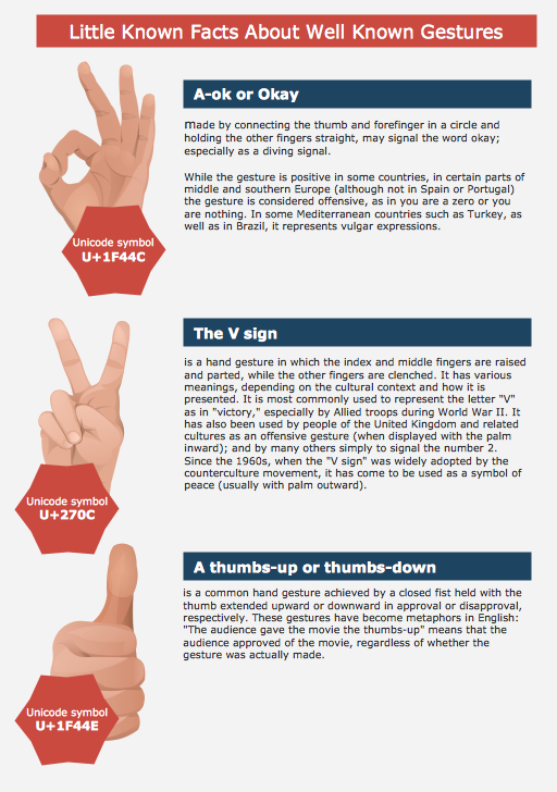 Using the Gestures library for ConceptDraw DIAGRAM allows one to produce professional-looking illustrations in seconds. High resolution vector illustrations are perfect for presentation needs. This illustration scales properly for large screens.