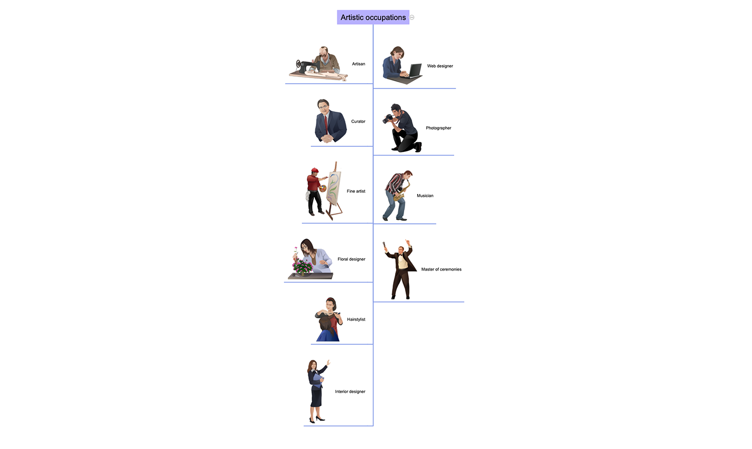 This Mind Map depicts the list of popular artistic occupations. The information is represented not only in a textual form but is accompanied by bright and colorful clipart illustrating the corresponding occupations. Among the most popular artistic occupations, you can meet the fine artists, artisans, web designers, photographers, curators, musicians, floral designers, interior designers, masters of ceremonies, and hairstylists. All artistic occupations are associated with the creativity, art, imagination, taste, and sense of beauty, with the creation of exclusive things by own efforts and labor. The people engaged in these professions are usually especial people, interesting and extraordinary, finely feeling the world surrounding them, all its colors, textures and sounds. This list can be extended per your desire – simply add the artistic occupations that you know and consider important as the topics on this map, and don't forget to supply them with clipart from the ConceptDraw MINDMAP graphical sets.