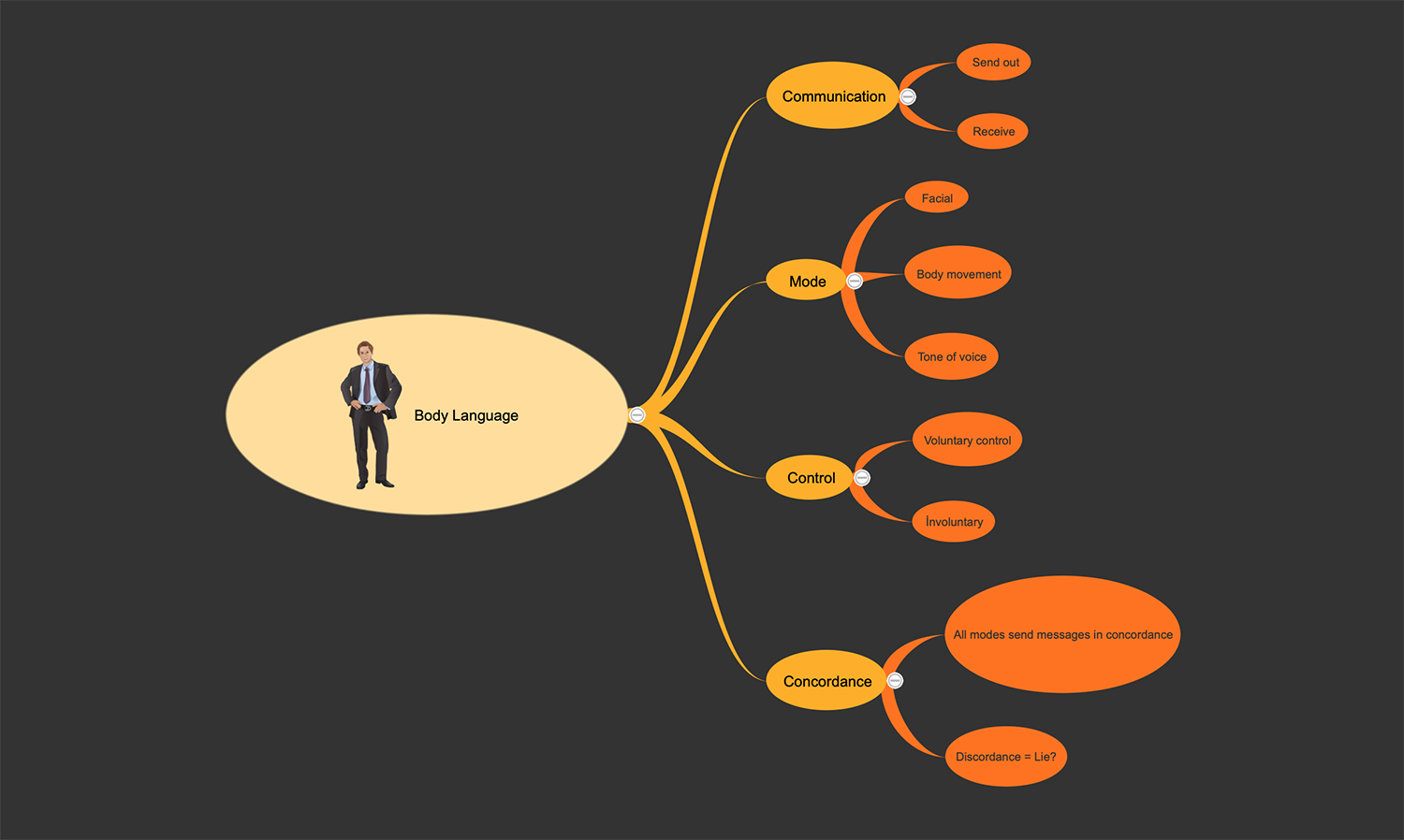 This Mind Map is dedicated to body language. It’s an incredibly interesting thematic because communication plays a huge role in people's live. The body language is a nonverbal communication used to express and to convey information. It reveals really actively in a process of communication, along with our speech. The body language is all our behavior, gestures, facial expressions, eye movement, hands movement, body postures, touches and also the use of space, which allow consciously or unconsciously convey the humans' thoughts, emotions, and feelings. However, the natural body language should not be confused with a specially designed sign language for the people with hearing dysfunctions, the pantomime language, or the special professional gestures and gestures specific for a particular culture or religion. The nonverbal body language complements the people's verbal communication and often includes a majority of transmitted information. However, the interpretations of the body language can vary from one country or culture to other ones.