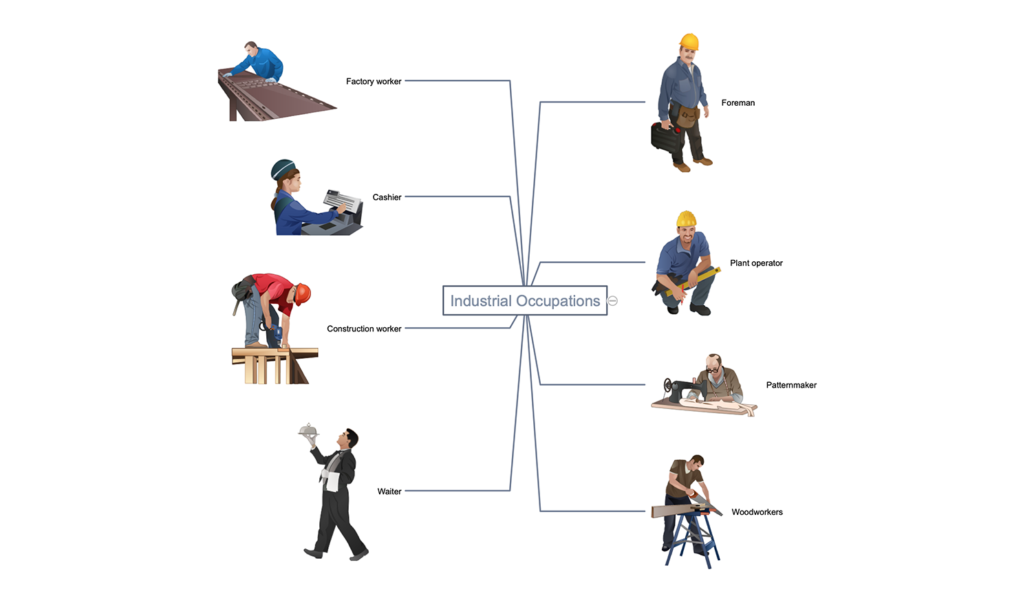 This Mind Map sample demonstrates the industrial occupations, among which are the following: factory worker, foreman, cashier, plant operator, construction worker, patternmaker, waiter, and woodworker. Typically, the industrial occupations are characterized by a high labor intensity, the application of manual labor, often assume having little bit knowledge and mainly do not require higher education. Despite these facts, the workers of industrial occupations are really important and the most part of all that surrounds us was created by people of these occupations. In general, the industry is the most important factor in the development of humanity, countries and states. The modern industry is multifarious and this Mind Map is just about people engaged in the light, heavy, chemical, woodworking, mining, metallurgical, coal, gas, oil, food, and other industries. Of course, each of these industries also involves the employment of the highly skilled workers, the humans of not working occupations and with higher education — directors, managers, engineers, etc.