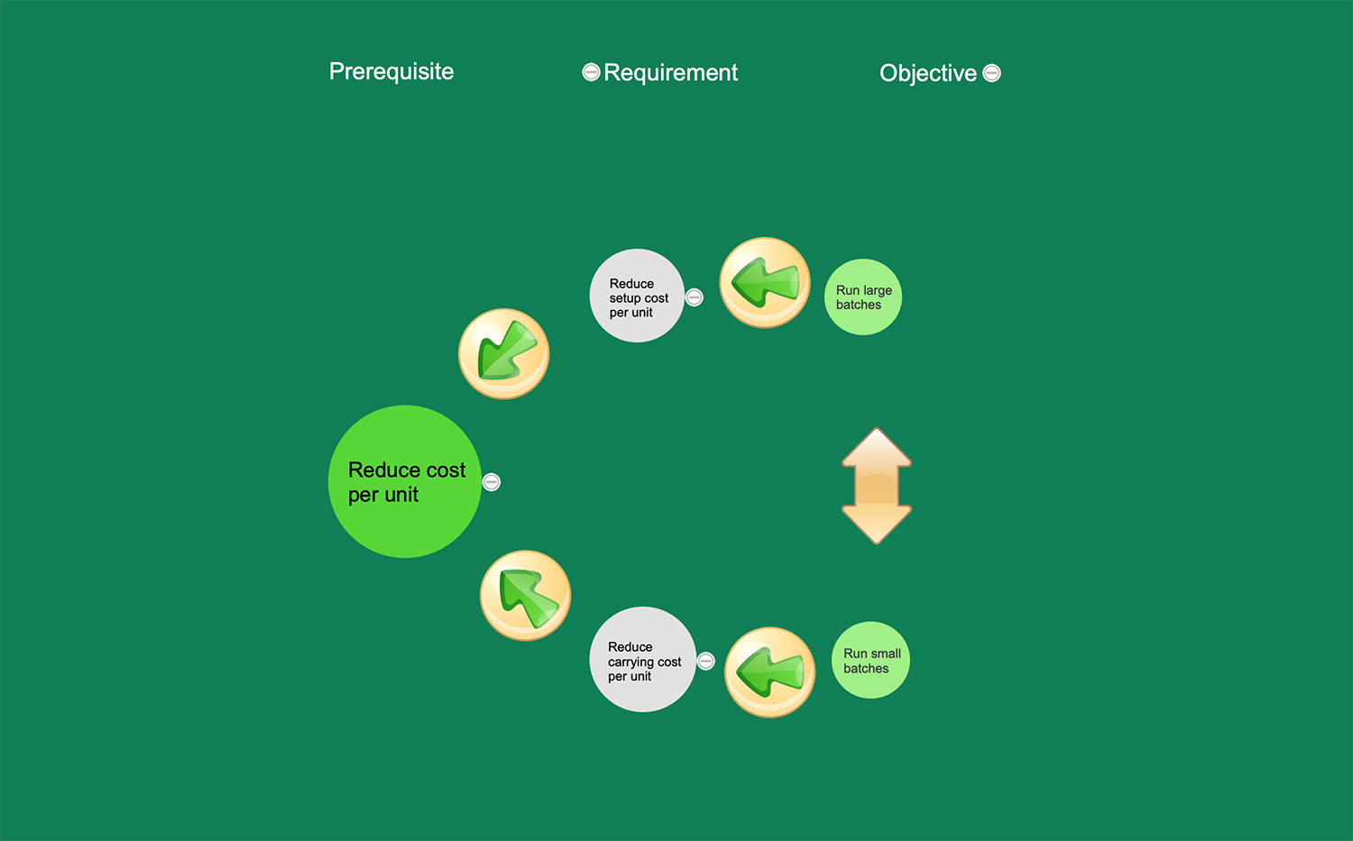 This Mind Map demonstrates the evaporating cloud example or conflict resolution diagram according to the reducing cost. It is a common structure of the Evaporating Cloud (EC), which is one of six Thinking Processes in the Theory of Constraints. The Evaporating Cloud represents a logical diagram depicting a problem that has no evident acceptable solution. It is effective when used for solving conflict, dilemma or trade-off situations. The Evaporating Cloud supposes the examining of assumptions behind the logic and diagramming logic behind the conflict. The five nodes of the diagram are laid in a form of evaporating cloud as it is represented on this map. They depict two opposing wants composing a conflict, two needs that require to be satisfied, and a common goal that both these needs try to perform. The arrows you see on the map are the rationale or causal assumptions linking the nodes, they can be interpreted as “because”, “so that”, or “in order to”.