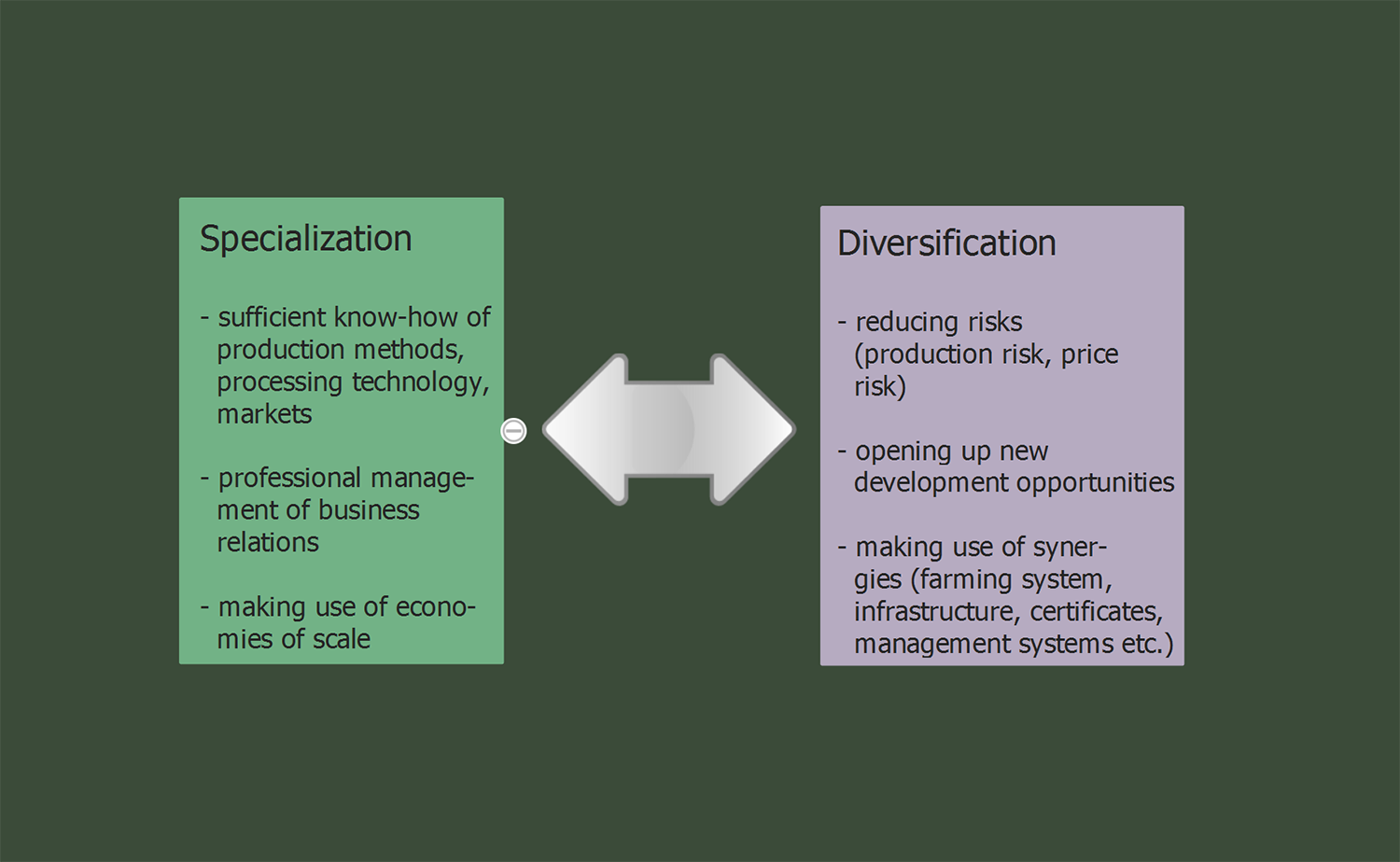 This Mind Map sample represents the specialization options vs diversification ones between which the organic businesses make their choice. The specialization, possession of specific knowledge in a certain field are obligatory for becoming really successful in this field. It is needed to be the expert, to know specific production and processing technologies, methods, and market requirements to develop a high-quality product. That is why most enterprises are the single-purpose and focused on a small number of products or a single product. The specialization lets professional managing the business relations and using the economies of scale. In its turn, the diversification assists in reducing production risks, enhancing food security, improving rotation in the farming system, opening new development opportunities, distributing costs, reducing the vulnerability of enterprises to the market fluctuations, responding flexibly to the changes in a business environment, making use of synergies. All these pros and cons are accurately depicted in this sample.