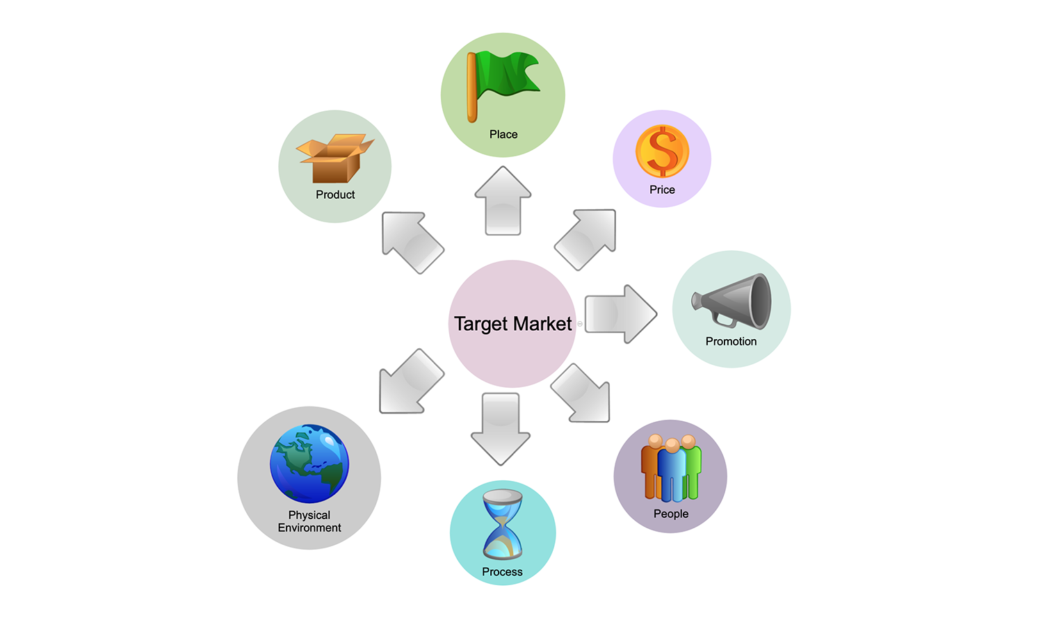 This Mind Map illustrates the target market and 7P principle that includes product, place, price, promotion, people, process, physical environment. Each of these components can bring a competitive advantage for the company, but only in a complex they become an ideal tool, one of the most effective marketing tools. 7P is effective in the sale of services and helps to gain a leading position at the market. Typically, each business and marketing strategy and program is based on the deep learning and analysis of the target market. At this, the development of the marketing program and effective positioning strategy requires an obligatory understanding of the target market, the motivations of consumers to purchase a specific product or brand. The Mind Map is made in the form of a circle-spoke diagram and depicts the marketing basis, relationships, and also interactions between the main components of the marketing strategy and the target market.