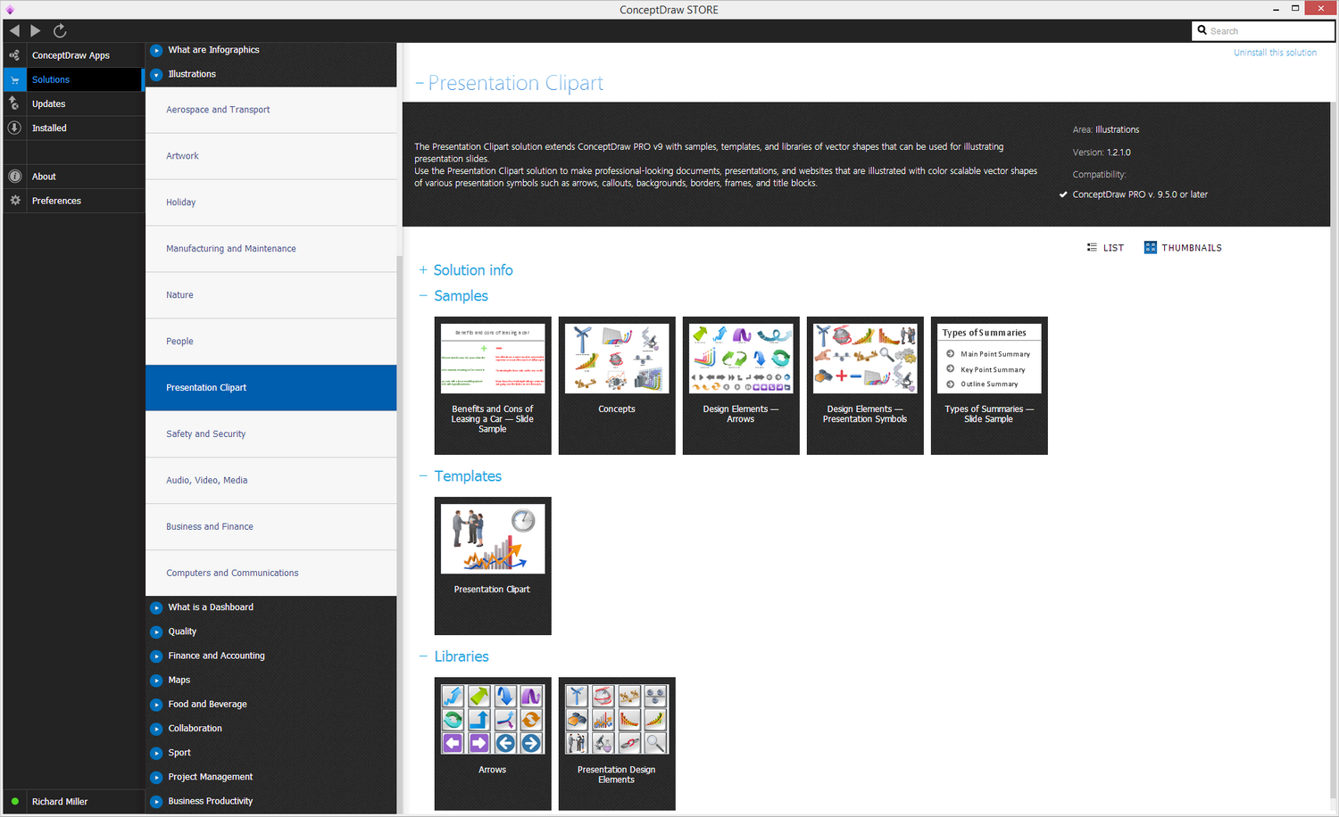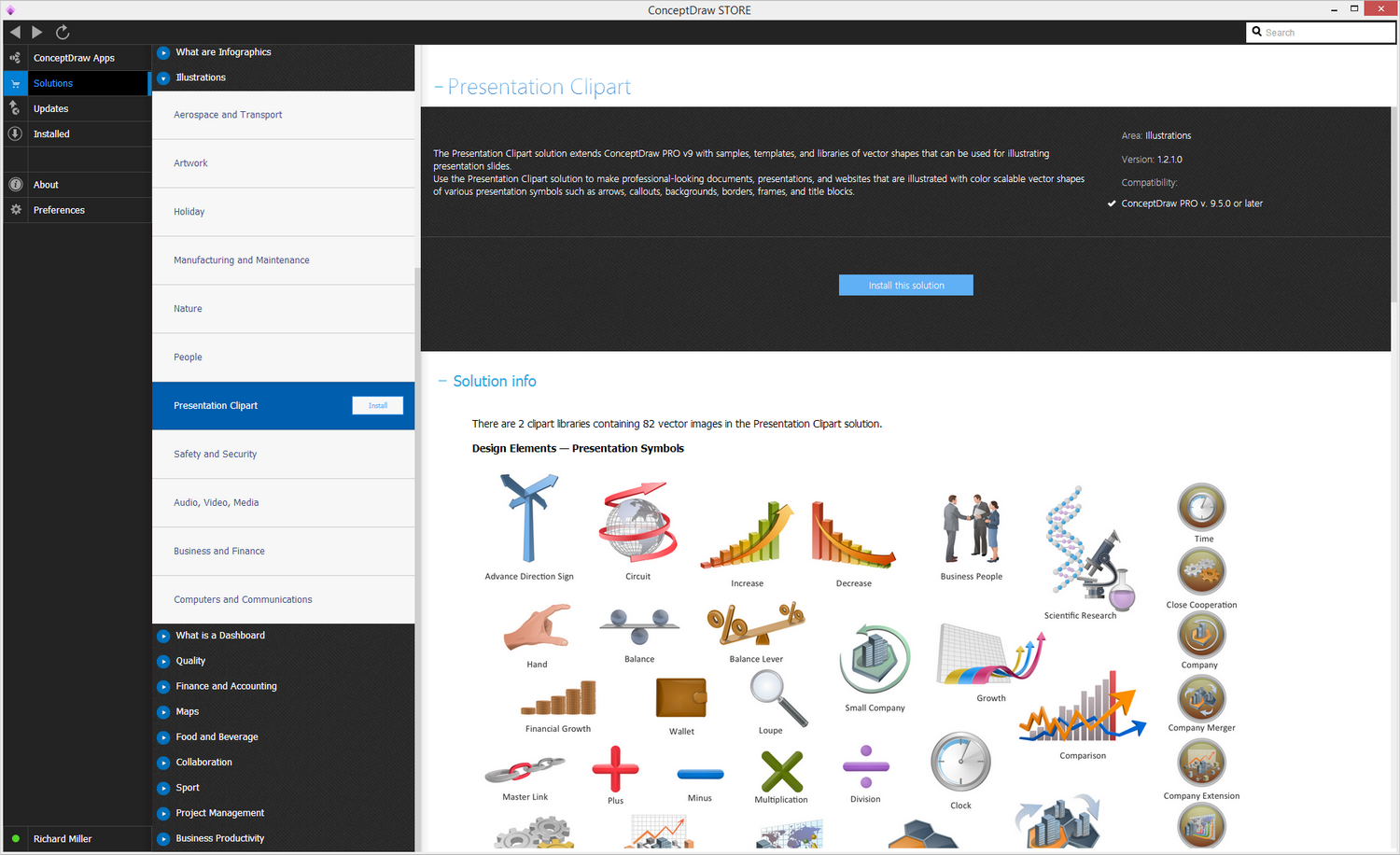 After ConceptDraw STORE and ConceptDraw DIAGRAM are downloaded and installed, you can install the Presentation Clipart solution from the ConceptDraw STORE.
