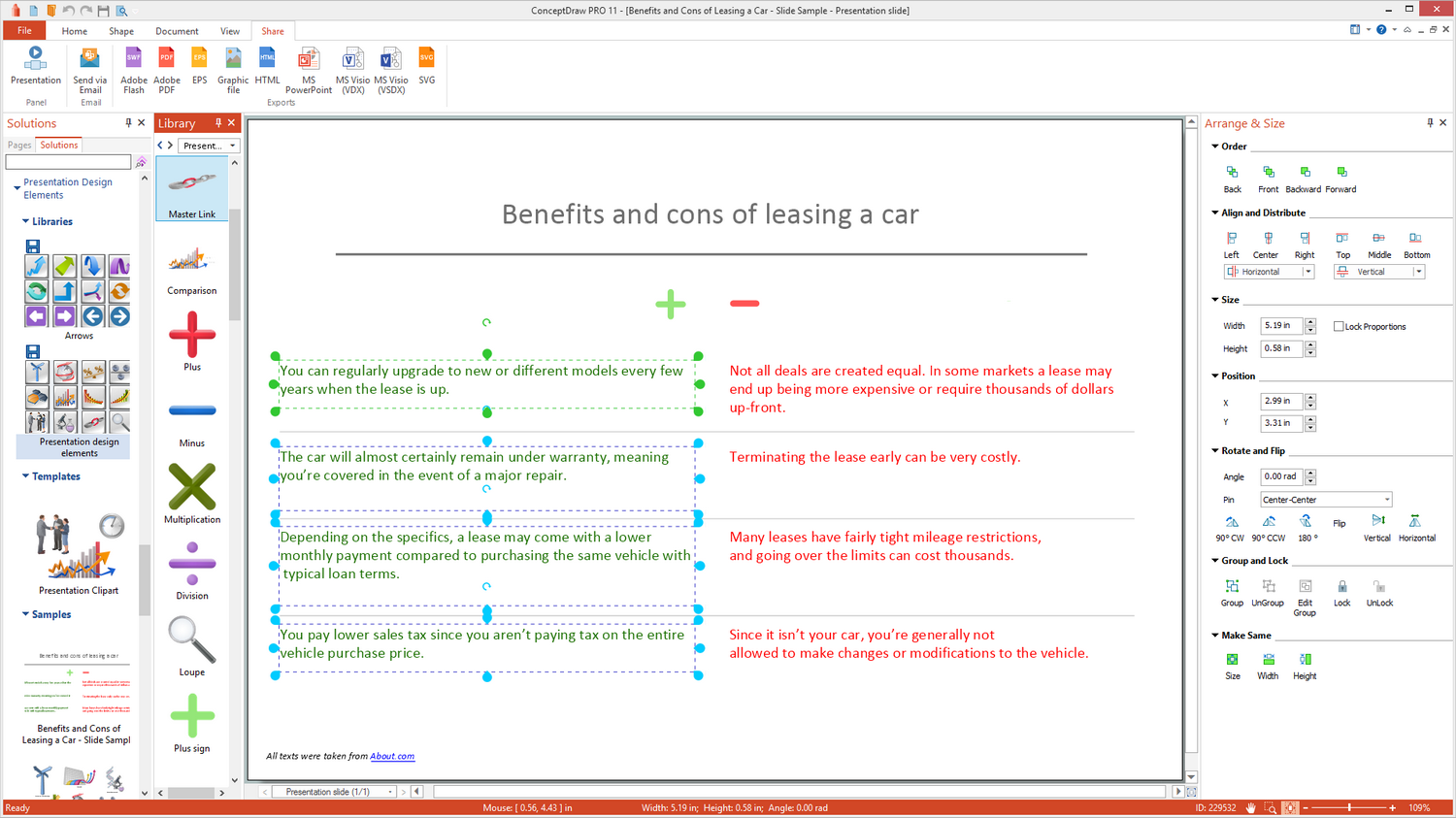 The secret of producing professional-looking presentations lies in a harmonious combination of texts and symbols. Simple visual markers, such as plus and minus signs in this example, facilitate the perception of your story, and make your presentation clear and bright.