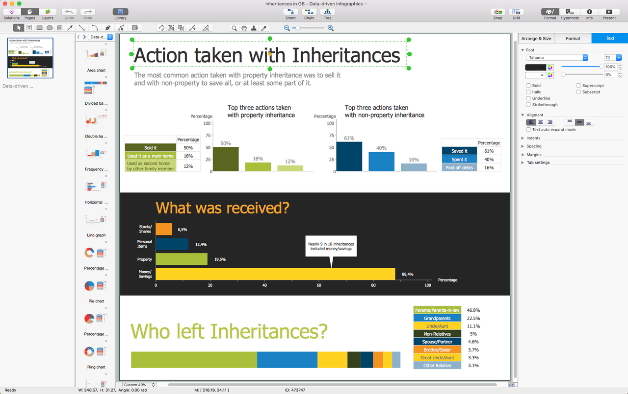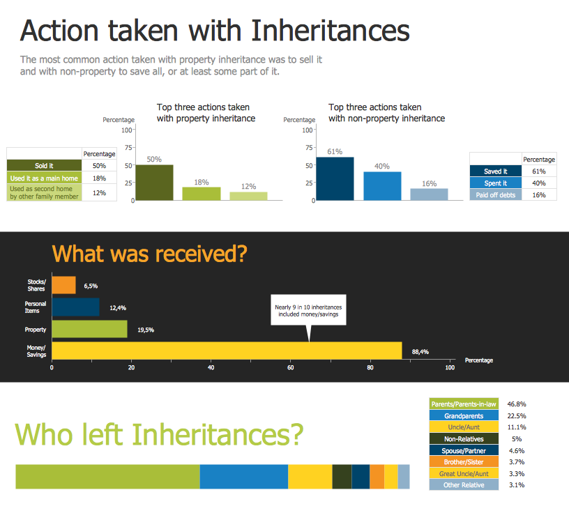 This sample created with infographics tools of Data-driven Infographics Solution for ConceptDraw DIAGRAM isualizes the Inheritances in GB and the actions taken with them. All objects from the Data Driven Charts Library are smart objects – simply change the data at the tables and charts will change their views automatically.