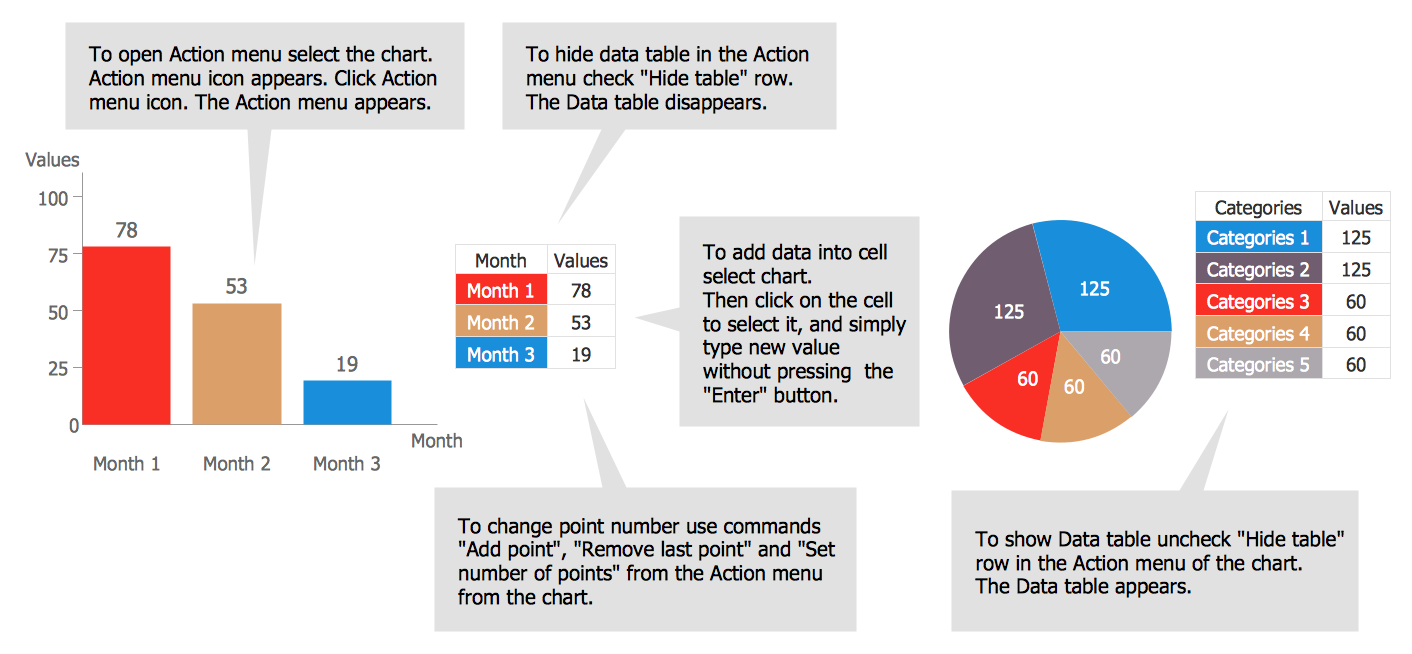 To make life easier on the user, and to facilitate the rapid updating of information within an infographic, each chart or graph object found in the solution is 'smart' in nature, and comes with its own data source. The values you enter into this data source effect the values represented in the graph, allowing you to re-enter data, resize charts and keep up with current business trends without completely overhauling your design. Sharing the infographics you create using ConceptDraw DIAGRAM is also an ideal way of giving clarity to the workforce and keeping them on message.