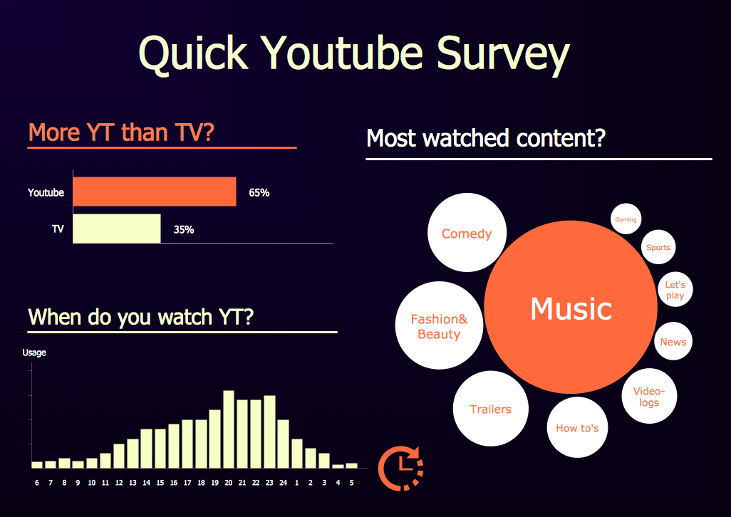 This Data-driven Infographic illustrates the Quick Youtube Survey. Make an infographic in ConceptDraw DIAGRAM quick and easy using the predesigned objects from the Data Driven Charts Library. Play with colors to make your chart pleasant to those whom you will show it.