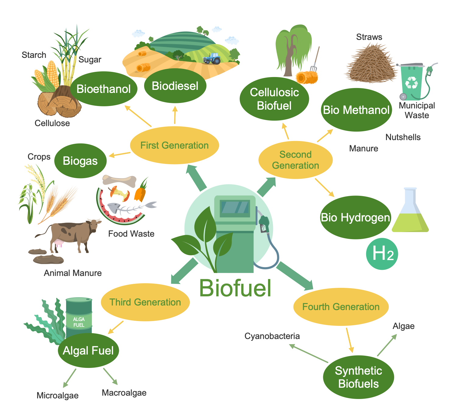 This sample shows a variety of biofuel types and classifies them by generation. Biofuel is a type of fuel produced from biomass at the application of special contemporary processes. Most biofuels are liquids and gaseous fuels. They include biodiesel, bioethanol, cellulosic biofuel, bio methanol, bio hydrogen, algal fuel, synthetic biofuels, and biogas. Biofuels are classified by generation and four generations are counted at the moment. First-generation biofuels are made from plants like crops, sugar cane, also starch, cellulose, animal manure, and food waste. The transesterification and yeast fermentation methods are used. Second-generation biofuels are produced from lignocellulose, woody biomass, straws, bagasse, perennial grasses, domestic, agricultural, municipal, and more waste. The third-generation biofuels are cleaner energy. They are made from microalgae and macroalgae, and their production is cheap. These biofuels are more energy intensive than biofuels of the first and second generation, biodegradable and fully renewable. Algae don't require special conditions and grows in the salt water of oceans and lakes, wastewater, etc. Cyanobacteria and algae are used for fourth-generation biofuels.