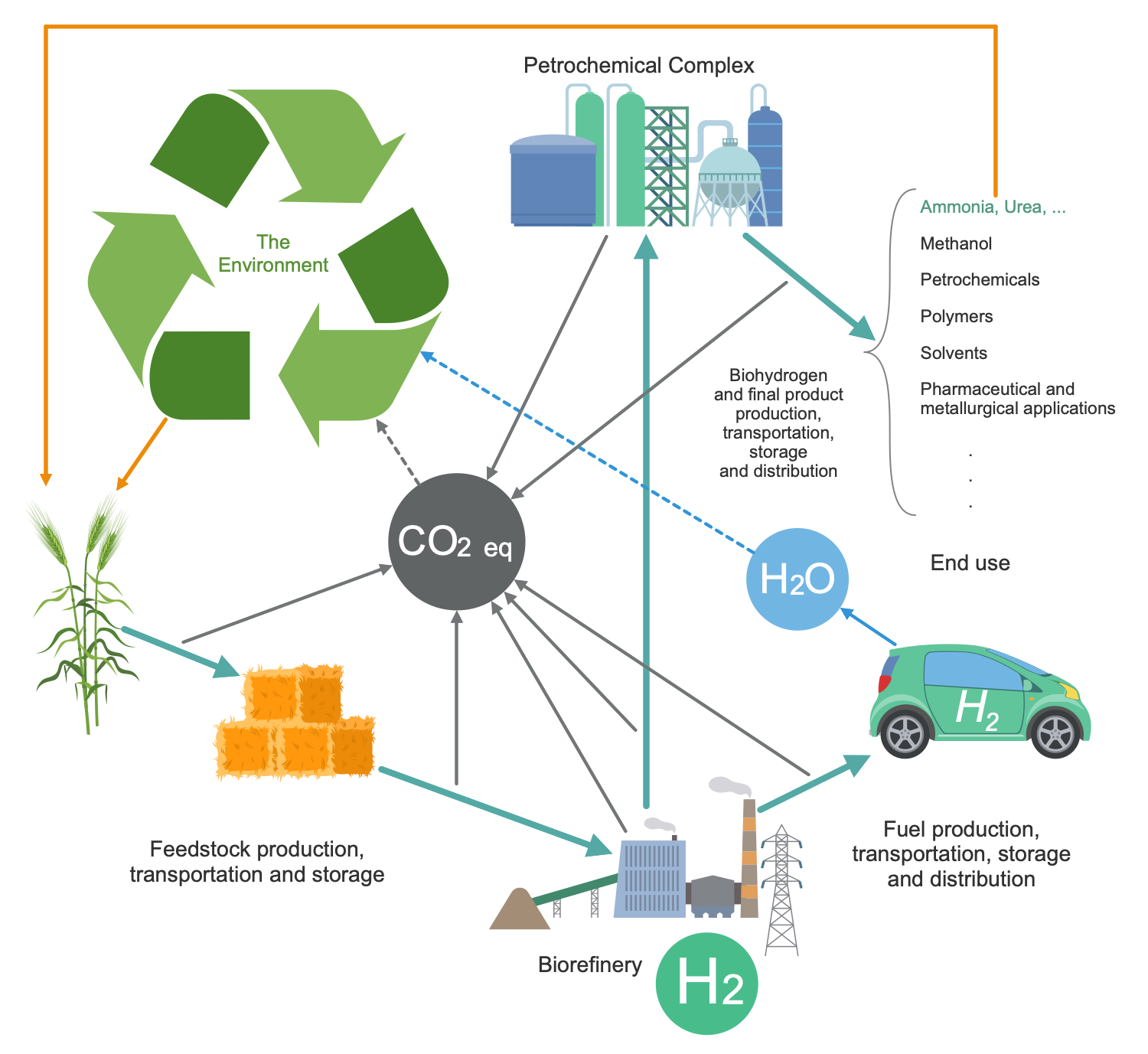 This sample shows a general schematic of steps in biohydrogen production and use. All steps from feedstock production and processing to the transportation, storage, distribution, and end-use are presented. Biohydrogen is H2 biologically produced from certain kinds of biomass. It is a clean fuel, but there are some difficulties with the storage and transportation of a noncondensible gas. In addition, the yield of H2 is low and hydrogen-producing organisms are often poisoned by O2. Biohydrogen is mainly produced from algae and formed in a closed photobioreactor. There are two methods of biohydrogen production from biomass: thermochemical and biochemical. In normal conditions, algae produce oxygen using photosynthesis, but in conditions of sulfur lack, was noticed their trend to produce hydrogen. This capability is used in the biochemical production of biohydrogen. The thermochemical method involves heating the biomass without oxygen access to 500-800 °C, as a result, H2, CO, and CH4 are released.