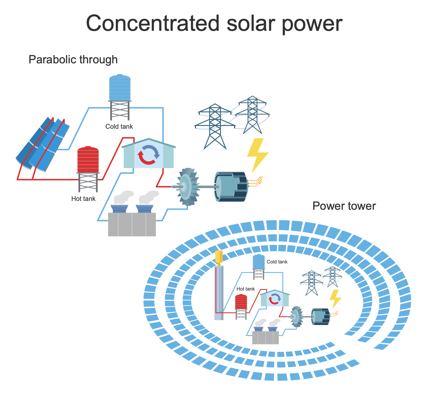 This green energy infographics sample is dedicated to concentrated solar power (CSP) used to produce electricity. The solar power is generated by CSP stations by means of using mirrors or lenses with tracking systems to concentrate a large area of sunlight onto a receiver. The concentrated light is used as a heat source for a power plant. CSP stations are similar to coal, gas, or geothermal power stations. They can include thermal energy storage and store energy in the form of sensible heat or latent heat. This enables electricity generation in any daytime or nighttime. Being converted to heat, the concentrated light powers a thermochemical reaction or drives a heat engine connected to an electrical power generator. This leads to electricity generation. A work of a parabolic trough system structure is based on the use of a linear parabolic reflector. It concentrates light onto a receiver located at the focal line of the reflector. A solar power tower includes dual-axis tracking reflectors, sunlight is concentrated on a central receiver atop a tower.