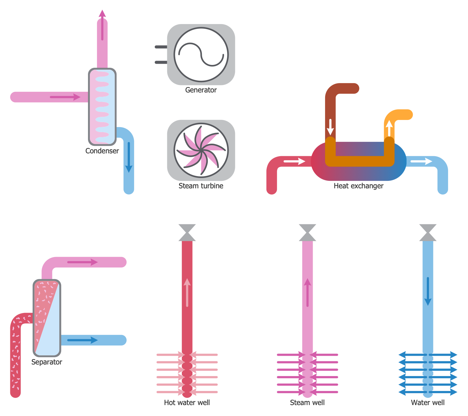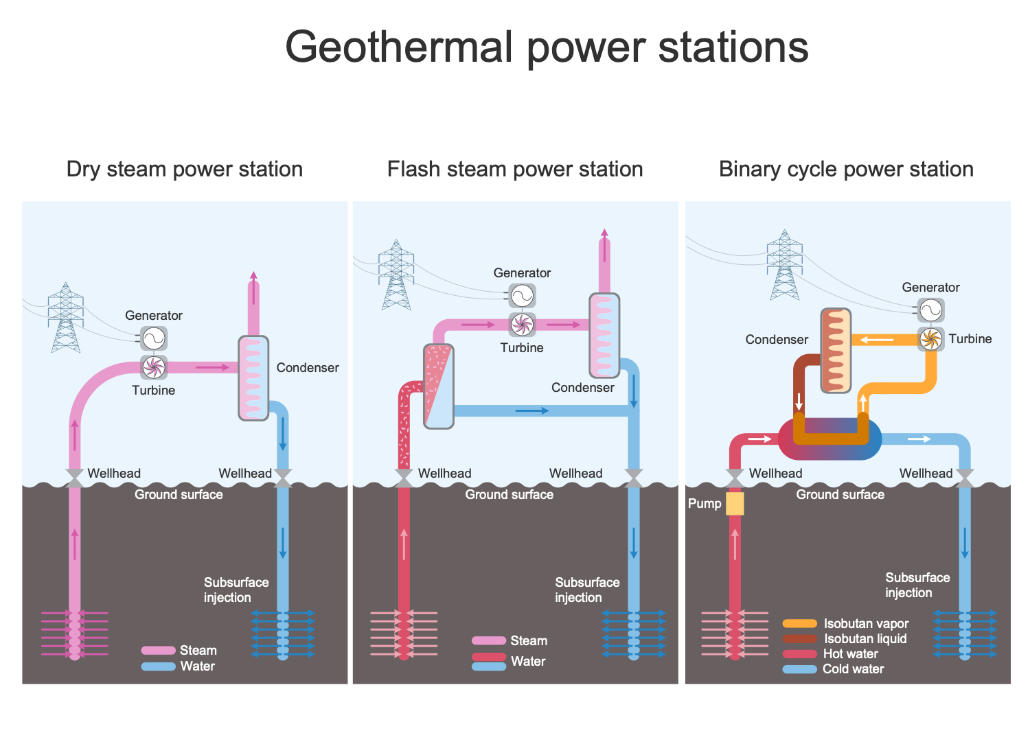 This sample shows three kinds of geothermal power stations. The first is a dry steam power station. It generates electricity in a vapor-dominated hydrothermal system. Steam is injected directly from the subsurface wells and drives a turbine generator. In turn, wastewater from the condenser is injected back into the subsurface. The second is a flash steam power station including a hot-water hydrothermal system. Hot hydrothermal water is injected from the subsurface, partially flashed to steam, separated, and then used to drive a turbine generator. Wastewater from both separator and condenser is injected back into the subsurface, as well. Finally, a binary cycle power station is presented. It has two circuits. The first circuit uses hot water from a geothermal well and returns it to the underground reservoir at a lower temperature. The second one contains fluid with a low boiling point (isobutan). It is pumped at high pressure, vaporized, cold when passed through a turbine and cold air radiators, and returned back to the heat exchanger.