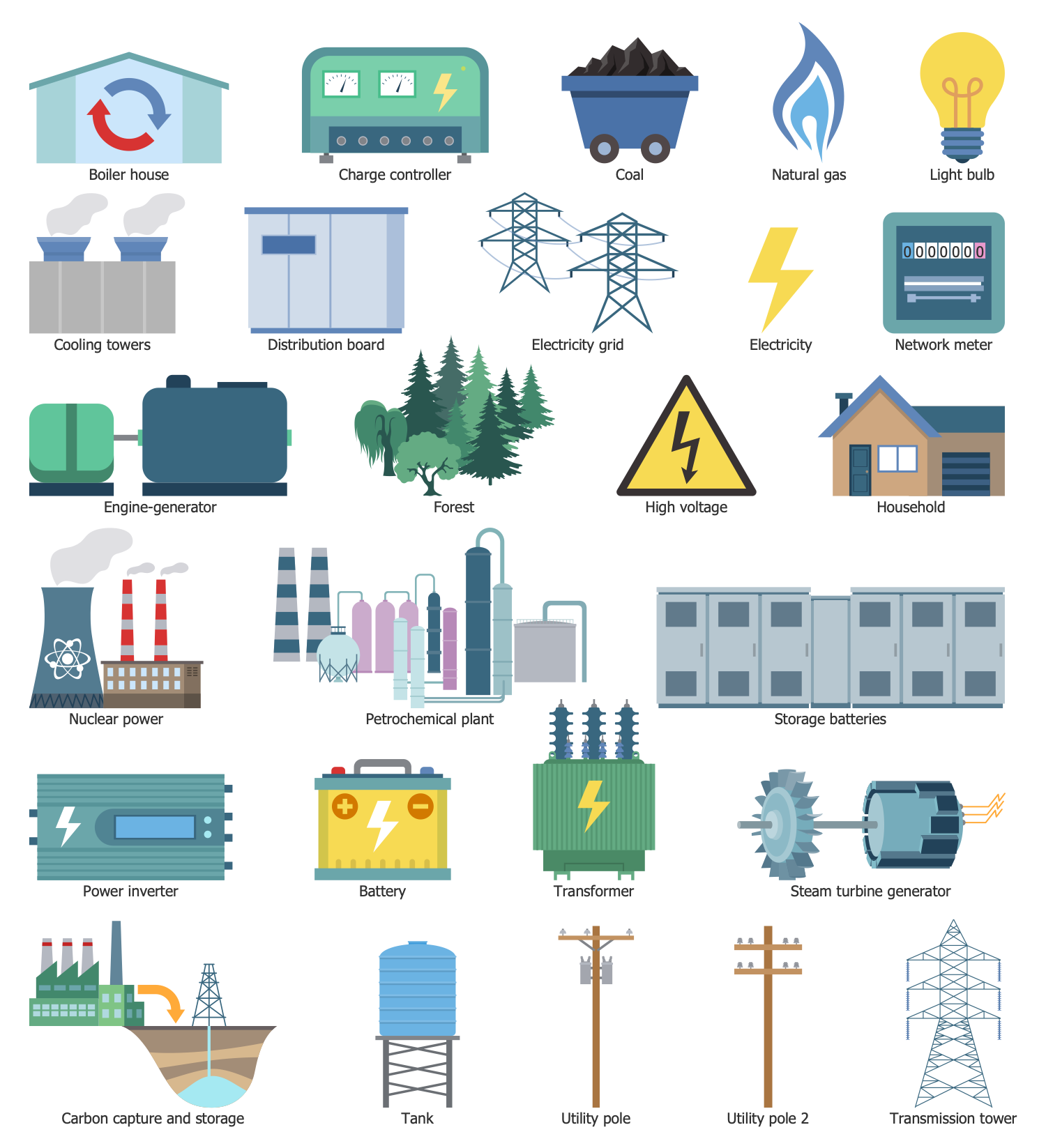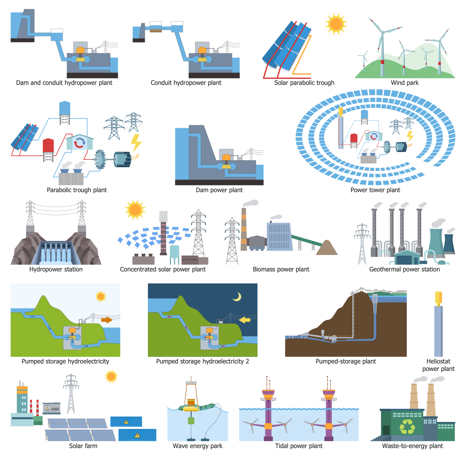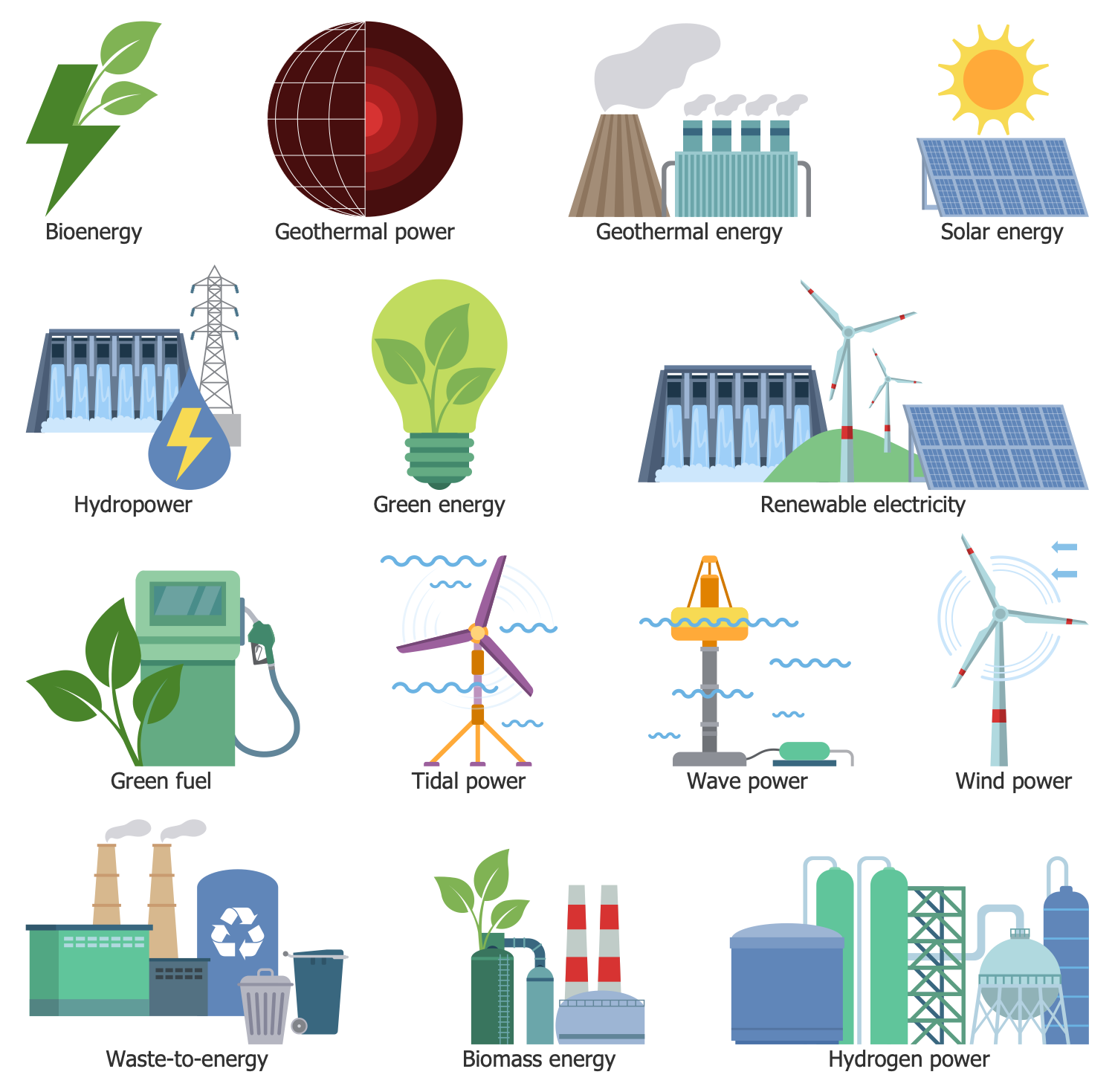 Green Energy solution extends the ConceptDraw DIAGRAM functionality with a large collection of vector design icons, pictograms, and clipart useful to design green energy infographics and illustrations of any kind. Create overview infographics about solar power, wind power, hydropower, tidal power and other renewable and cleaner energy sources. Compare visually different types of energy or data over several years in one chart. Develop detailed infographics about power generation mechanisms, how do solar panels work, wind and tidal turbines, and more specialized power generation equipment.