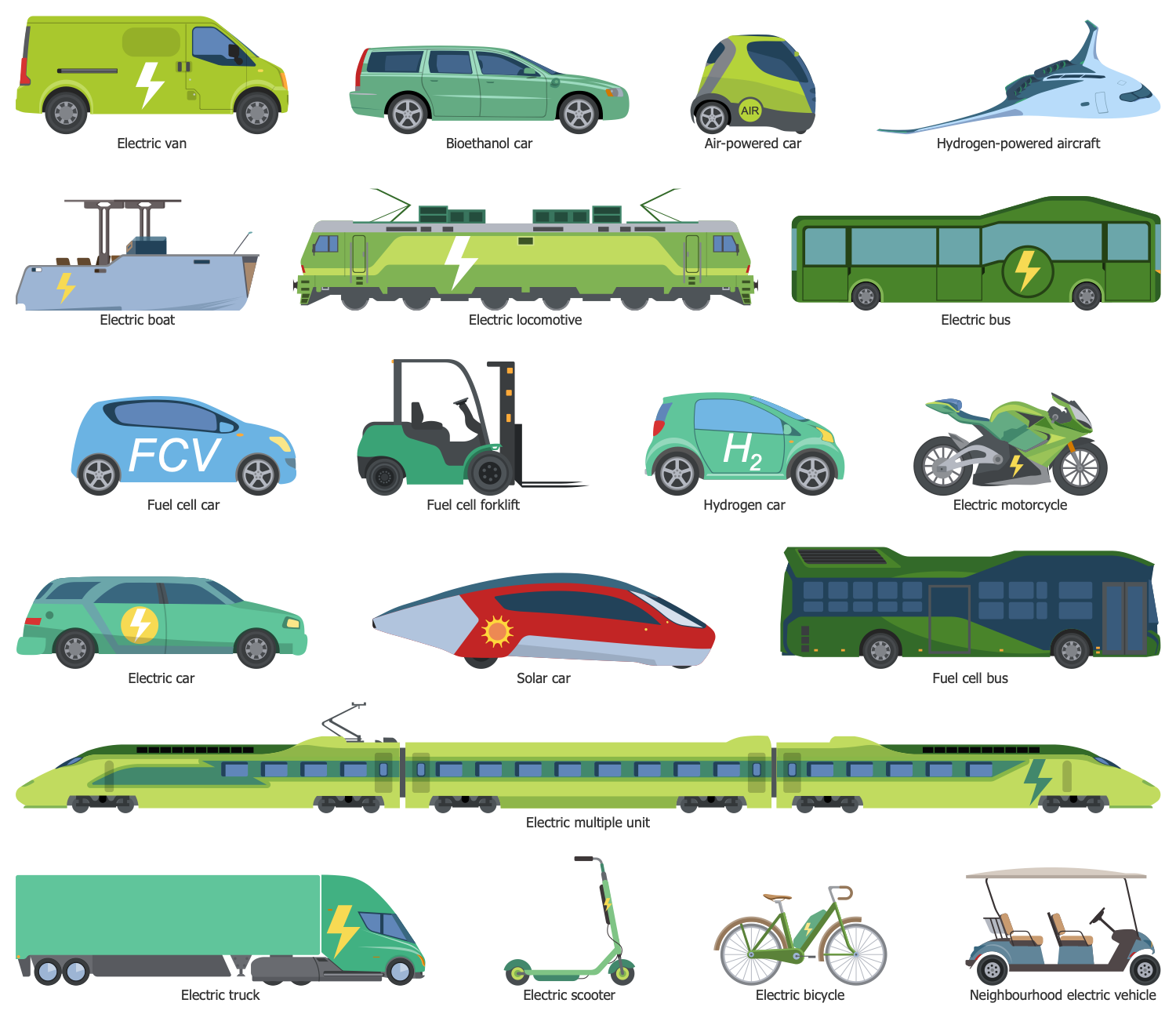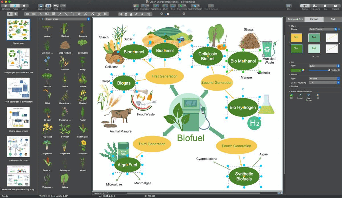 The Green Energy solution contains 15 examples and 14 libraries containing 272 vector graphics and icons, to allow you to create professional-looking documents.