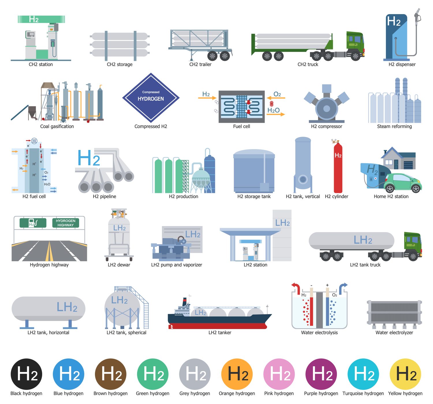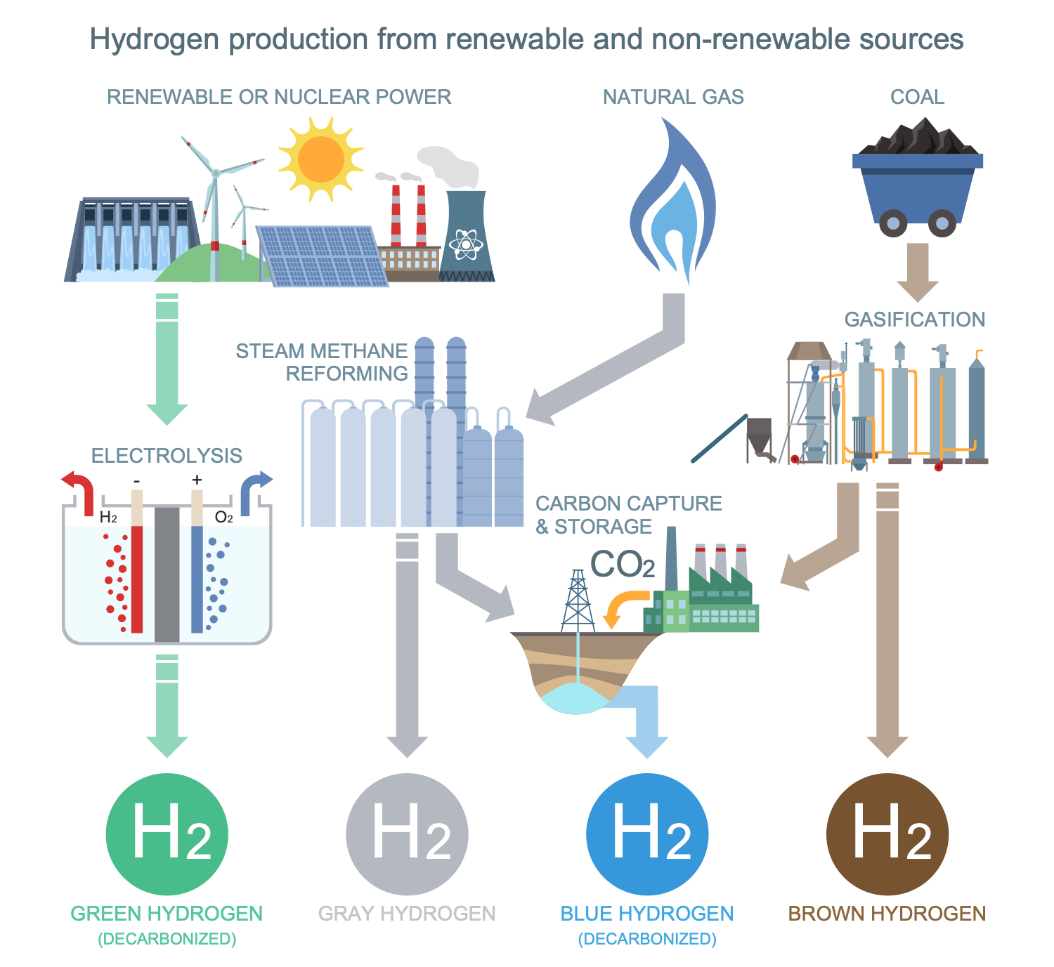 This sample shows the hydrogen production from renewable and non-renewable sources. Several types of hydrogen are differed according to the production method. The more carbon oxides are released during the production, the less environmentally friendly hydrogen is. Each type has its own hydrogen color code. Green hydrogen is the most environmentally friendly, it is obtained by electrolysis. All that is needed for this is only water, electrolyzer, and electricity. There are no CO2 emissions at the use of electricity from renewable sources. Gray hydrogen is produced by steam methane reforming consuming natural gas with releasing of carbon dioxide. Blue hydrogen is also produced by steam methane reforming, but carbon is captured and stored. This reduces emissions at the increasing the production cost. Brown hydrogen uses brown coal as a raw material. With the help of the gasification of brown coal, synthesis gas is formed. It is a mixture of CO2, CO, hydrogen, methane, ethylene, and other gases in small quantities. This production is the most polluting.