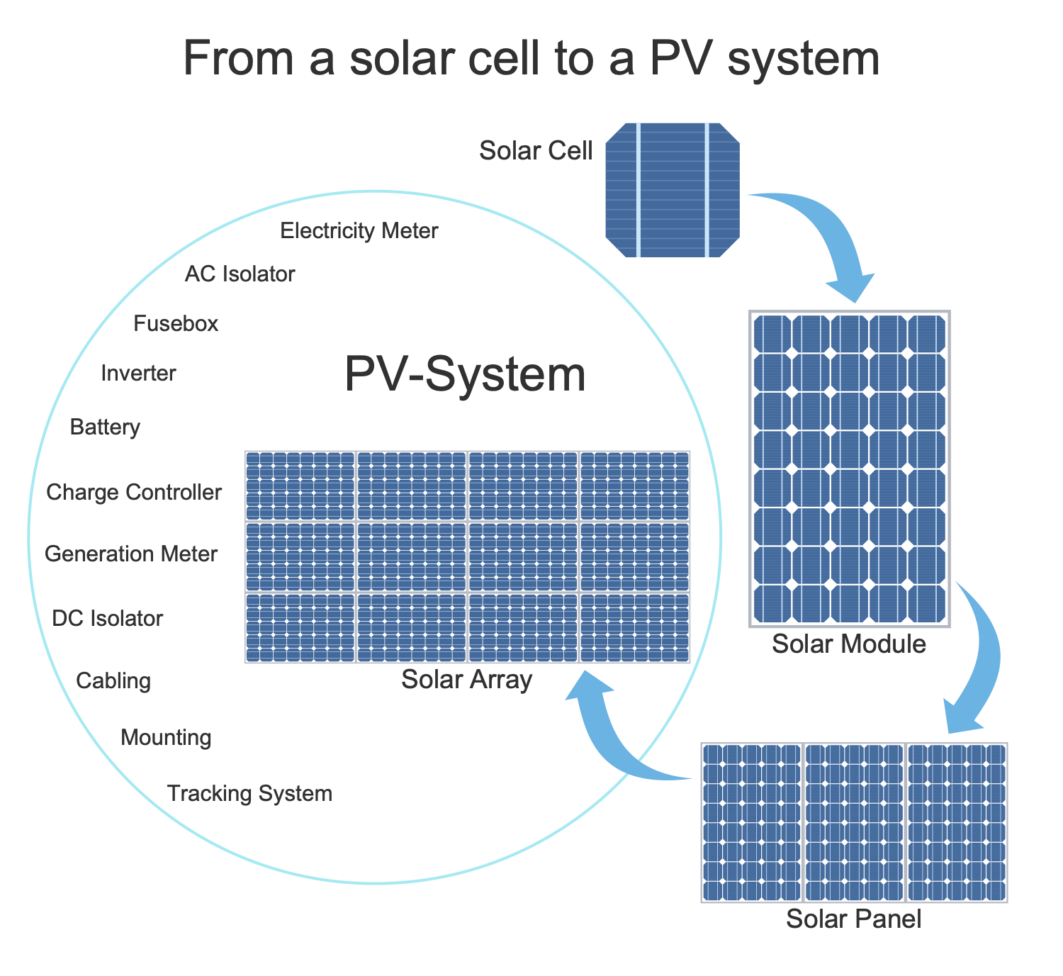 This sample shows the components of a photovoltaic (PV) system, step by step how it is constructed from the smallest segments to the whole system. PV systems range from small rooftop-mounted to large power stations, but all have a similar structure. A solar cell is the smallest part of a PV system. It is a special electrical device allowing absorbing sunlight energy and converting it directly into electricity by means of a photovoltaic effect. Typically, a single silicon solar cell can produce an open-circuit voltage of 0.5 to 0.6 volts. Electrical characteristics like current, voltage and resistance of a solar cell change when exposed to light. Multiple solar cells are placed in one plane and are connected to produce a solar module. A sheet of glass on the sun-facing side of a solar module allows protecting the semiconductor wafer at the simultaneous transmitting of light. In turn, several solar modules are united in a solar panel. A final PV system is formed from the array of solar panels. Visual infographics are incredibly useful to tell about how do solar panels work.