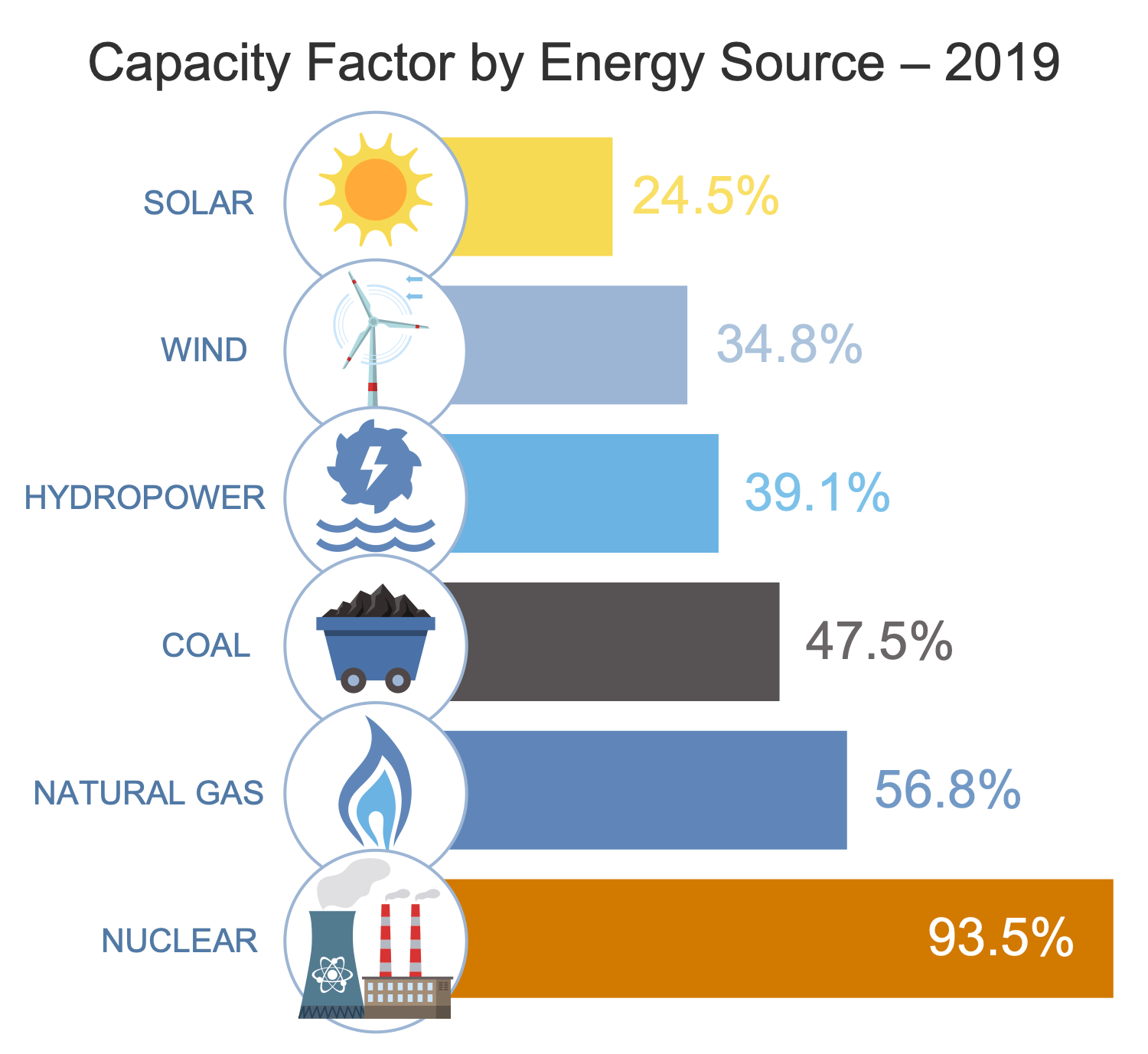 This sample shows the distribution of capacity factors by energy source in the U.S. in 2019. The capacity factor equals the ratio of actual electrical energy output over a given period to the maximum possible electrical energy output over the same period. Both values from this ratio depend on a wide range of factors. The maximum possible energy output of some electricity-producing installation is its capacity during continuous operation at full power over a defined period. Commonly the capacity factor is calculated for a year, but sometimes it is required to track seasonal fluctuations and here the month values are useful. Typically, nuclear power plants are at the top of the power factor range of energy sources. The U.S. also had the highest capacity utilization rate in 2019 at 93.5%, while natural gas at 56.8%, coal at 47.5%, hydropower at 39.1%, wind power at 34. 8% and solar energy — 24.5%.