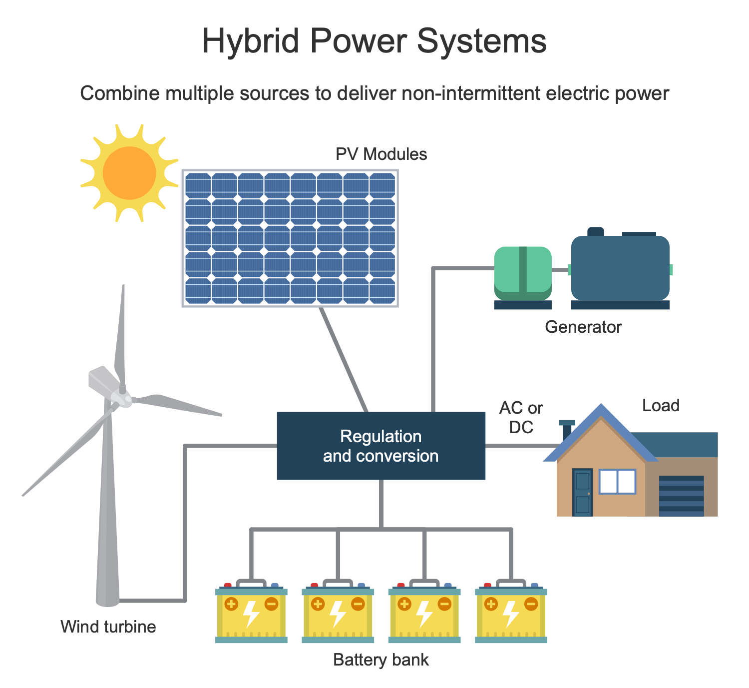 This sample shows a hybrid power system. It is a complete electrical power supply system combining several energy sources. It includes wind and solar power systems. The use of different energy sources allows ensuring the non-intermittent delivery of electric power. Because the operating time and effectiveness of wind and solar sources differ according to the time of day and year. The hybrid power system includes three major elements: power sources, battery bank, and power management center. The power control center is the main governing body of the system. It regulates power production from each of the sources, controls its conversion and use. The power management center is connected to AC or DC load, controls the distribution of loads, and protects the battery from service extremes. The sources include wind turbines, solar PV systems, and generators (diesel, thermoelectric). The battery bank provides an autonomous operation for the system by means of compensating the difference between power production and use.