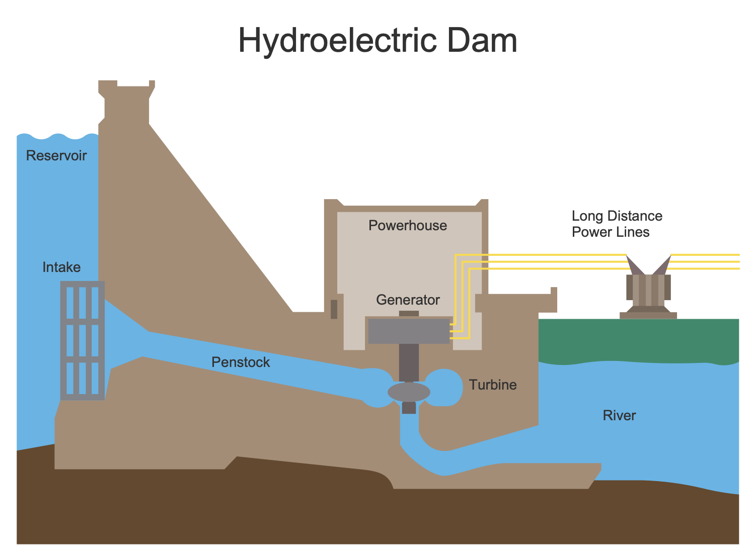 This sample shows a cross-section schematic of a hydroelectric dam of a conventional type. Hydropower is a method of sustainable energy production having a relatively low cost and no waste. It has a low output level of greenhouse gases and that's why is really popular. Hydropower is produced in 150 countries and constitutes over 20% of the world's total electricity and 88% of all renewable electricity. Hydroelectric power plants produce electricity using falling or fast-running water. The amount of energy produced by the station can vary rapidly and significantly and exactly the use of a dam or reservoir allows making hydropower a flexible source of electricity. The main mechanism lies in converting the gravitational potential or kinetic energy of a water source. In conventional dam hydroelectric the potential energy of dammed water drives a water turbine and generator. Water from the reservoir is delivered through a large pipe to the turbine. The volume and difference in height between the source and the outlet of the water affect the amount of energy recovered.