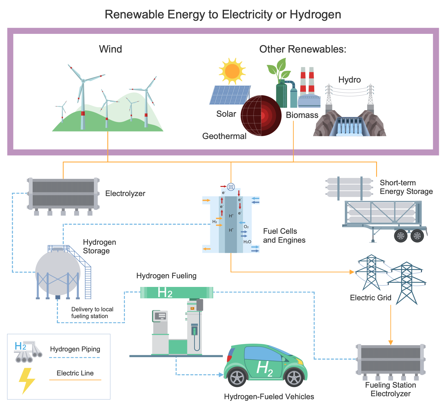 This sample shows the ways of producing electricity and hydrogen from ecology-friendly renewable energy sources. Renewable energy resources allow gaining energy from wind, sunlight, geothermal heat, tides, and more natural phenomena. They occupy wide geographical areas and have great potential. Water electrolysis is a major way to produce hydrogen, store the excess energy as hydrogen for further transportation and industrial use. Hydrogen and oxygen are released as byproducts in the electrolysis of water in an electrolyzer when electrical energy is converted into chemical energy. Two types of electrolyzers are applied at the moment: alkaline and proton exchange membrane (PEM). And one more type — solid-oxide-based high-temperature electrolyzers are in development. The main task of today's research is to lower the cost of electrolyzers with simultaneous increasing their efficiency, durability, and safety. The electrical energy is later recovered as a result of hydrogen reacting with oxygen in fuel cell vehicles and combustion engines.