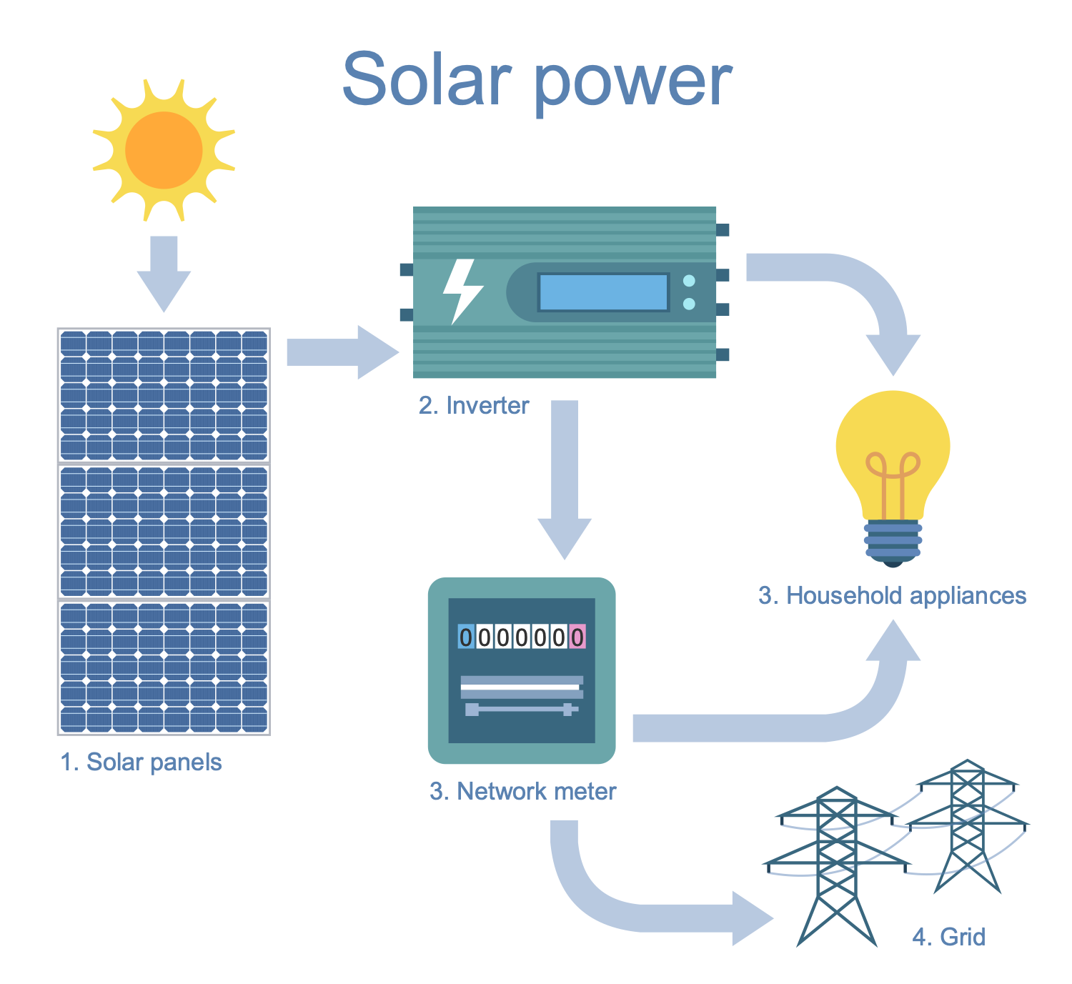 This sample shows how solar PV systems work. Solar energy, a form of alternative energy, relies on the use of sunlight to generate electricity. The use of a renewable source makes solar energy environmentally friendly, without harmful waste. The solar energy industry actively develops and volumes of use of solar PV increase year by year. The technologies are improved and their cost decreases. Solar PV systems convert the energy from sunlight into an electric current using photovoltaic (PV) cells and the photovoltaic effect. Multiple PV cells or solar cells are connected in a solar module. In turn, several modules form a solar panel. Multiple panels wired together build a solar array producing direct current (DC) power. It fluctuates with the sunlight's intensity. Then the arrays are tied to an inverter ensuring conversion of direct current to certain desired voltages or alternating current (AC). The electric current of suitable voltage is distributed through electrical grids to residential premises and enterprises.