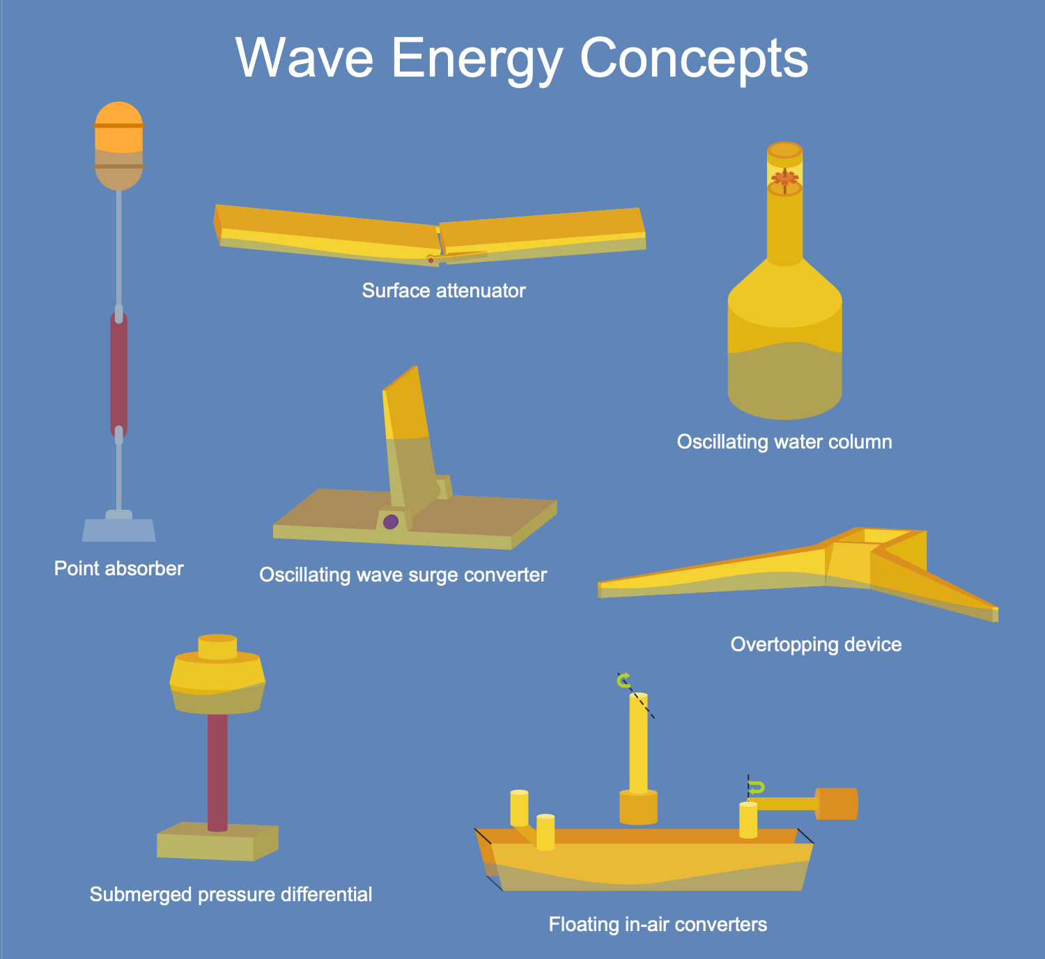 This sample is dedicated to the wave power that is the capture of energy of wind waves by wave energy converter (WEC) with a goal of electricity generation. At the moment, wave-power generation is not used as widely as solar energy, tidal energy, and hydropower. Wave power devices are classified according to location, power take-off system, and the method used to capture or harness wave energy. There are used absolutely different concepts and mechanisms to generate wave energy: point absorber, oscillating wave surge converter, oscillating water column, surface attenuator, overtopping device, submerged pressure differential, and floating in-air converters. Point absorber buoy floats on the surface of the water and uses the rise and fall of swells to generate electricity. The surface attenuator has several interconnecting floating segments; the protrusions create a bending motion driving the hydraulic pumps to generate electricity. Oscillating water columns contain built-in air chambers, and submersible differential pressure transmitters use membranes to extract wave energy. The shut-off devices use the speed of the wave and the reservoir fills to a higher water level than the surrounding ocean.