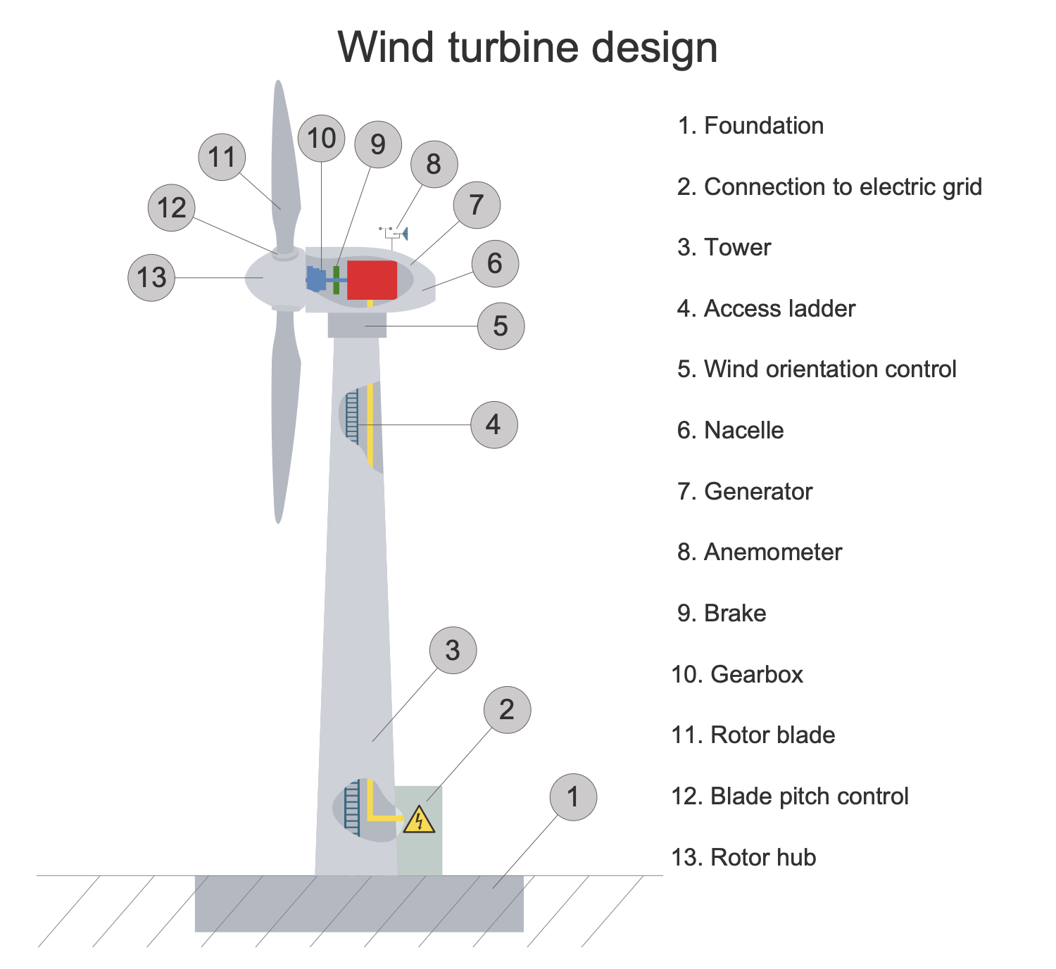 This sample shows a design of a wind turbine. The wind turbine design is the process of defining the best form and configuration to extract energy from the wind the most efficiently. A form and configuration of a wind turbine are chosen not random. The wind turbine includes the components capturing the wind's energy, pointing the turbine into the wind, and converting mechanical rotation into electrical power. It also includes the systems responsible for the start, stop, and control of the turbine. Among the main components are a foundation, connection to the electric grid, tower, access ladder, wind orientation control, nacelle, generator, anemometer, brake, gearbox, rotor blade, blade pitch control, and rotor hub. The required aerodynamic performance defines the shape and dimension of the blades, vortex generators control their lift characteristics. The centrifugal force on the blades increases as the square of the rotation speed, that's why the rotation speed needs to be controlled. A control system includes sensors and actuators to control and manipulate energy capture.