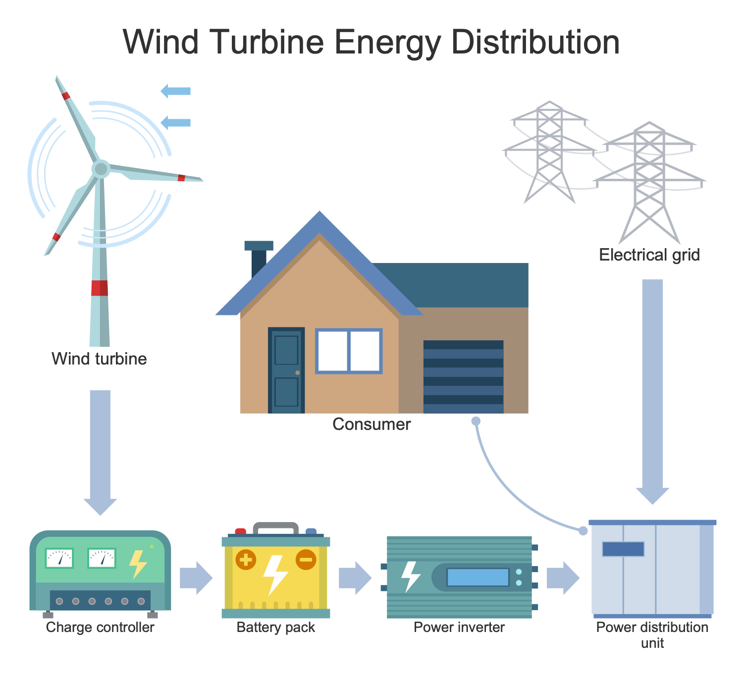 Wind turbines are the source of renewable energy widely used in many countries all over the world. They convert the wind's kinetic energy into electrical energy. Wind turbines help to lower energy costs, reduce reliance on fossil fuels, and decrease gas emissions and pollution environment. The turbines of different size, shape, number of blades, material, axis of rotation (horizontal or vertical), and pitch of the screw are constructed and used. Large wind turbines are used on an industrial scale and installed by the state or large energy corporations. The smaller ones are used to power small devices like traffic warning signs or provide auxiliary power for boats, etc. This sample shows a wind turbine energy distribution. The wind spins the rotor, the generated electricity is supplied through the charge controller to the batteries. The power inverter converts the voltage at the battery contacts into usable one. The electrical grids are connected with power distribution units, from where energy is distributed to the end consumer.
