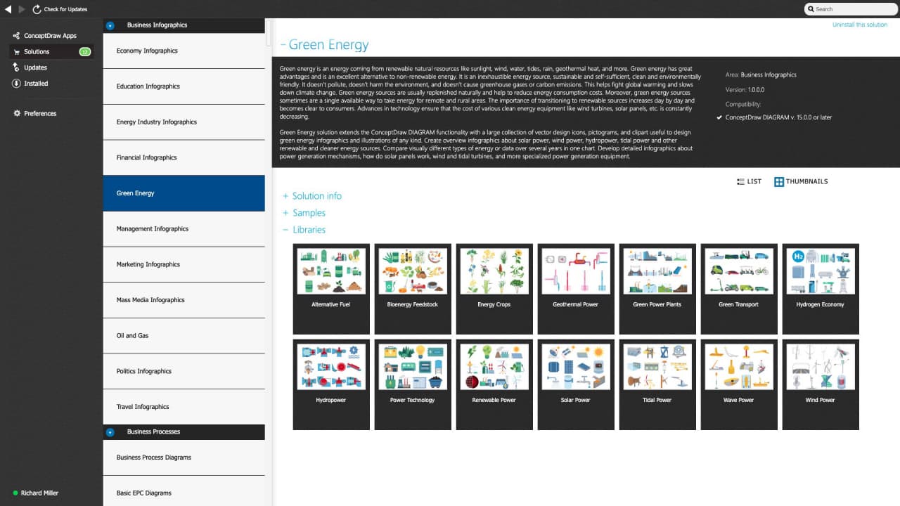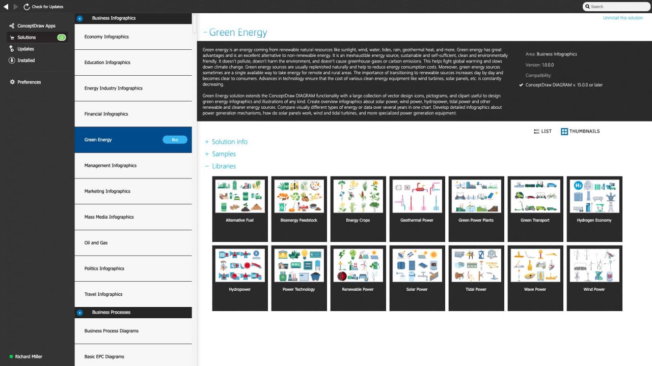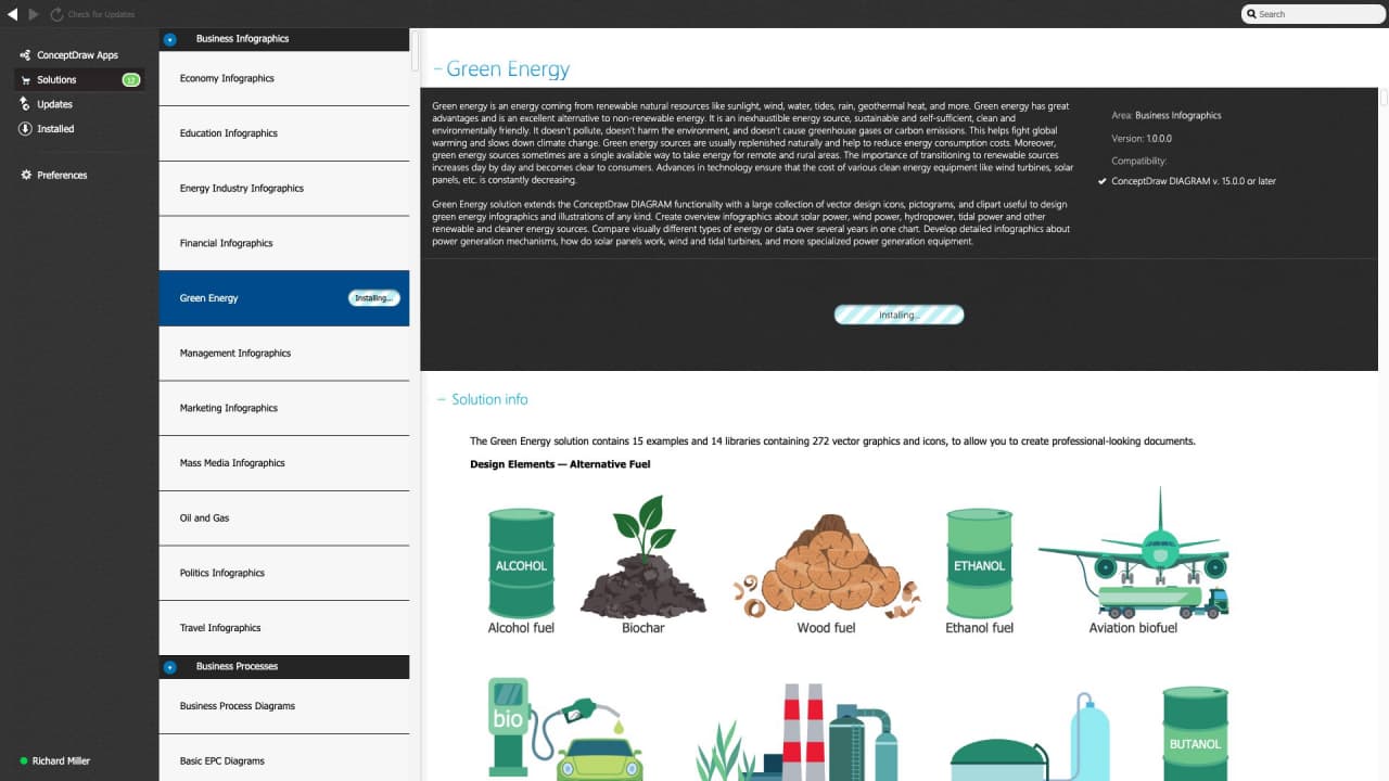 After ConceptDraw DIAGRAM is installed, the Green Energy solution can be purchased either from the Business Infographics area of ConceptDraw STORE itself or from our online store. Thus, you will be able to use the Green Energy solution straight after.